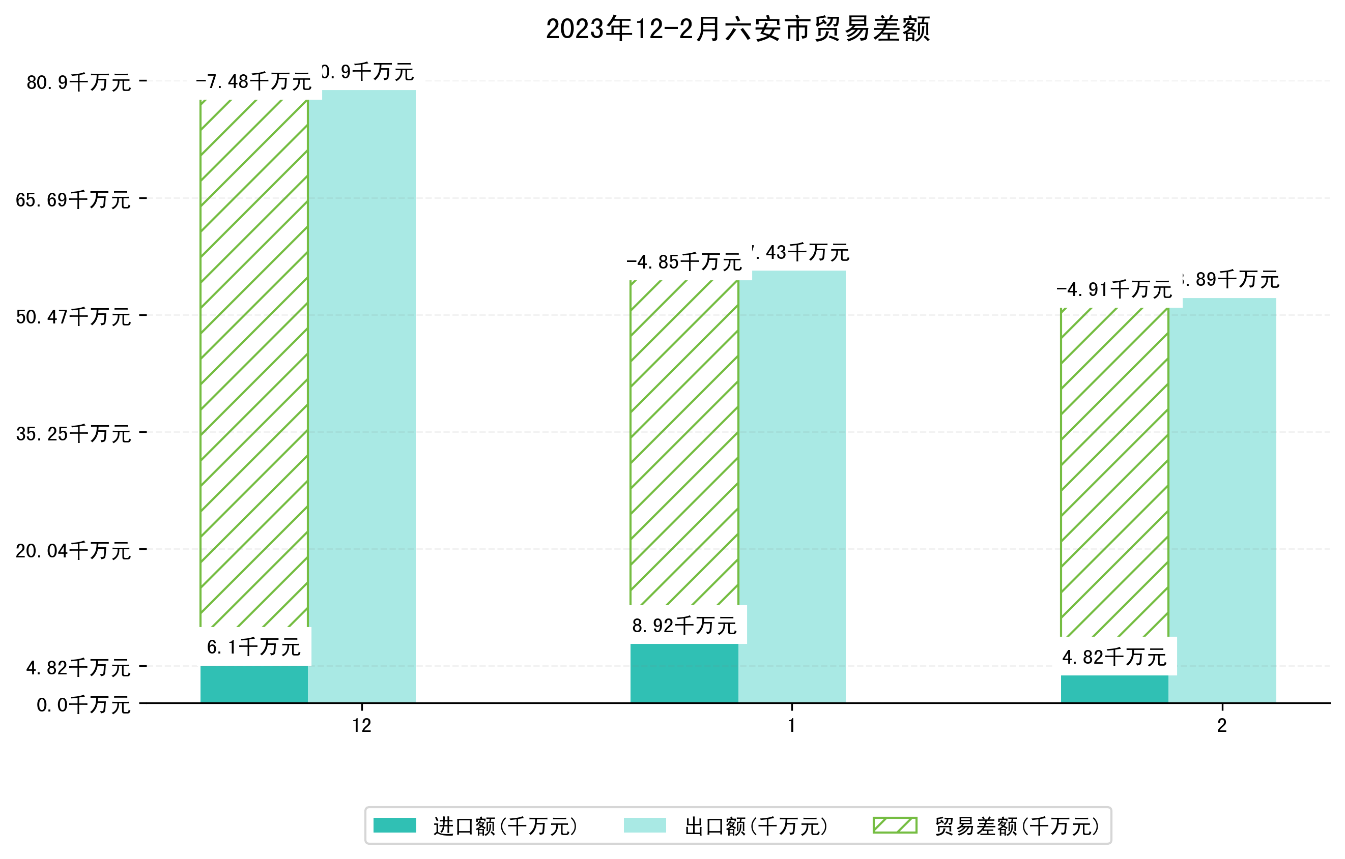 以人民币计,2023年1-2月六安市进出口总额为12,5060.973万元,相比上年同期增加了1,7381.6565万元,同比增加了16.30%。