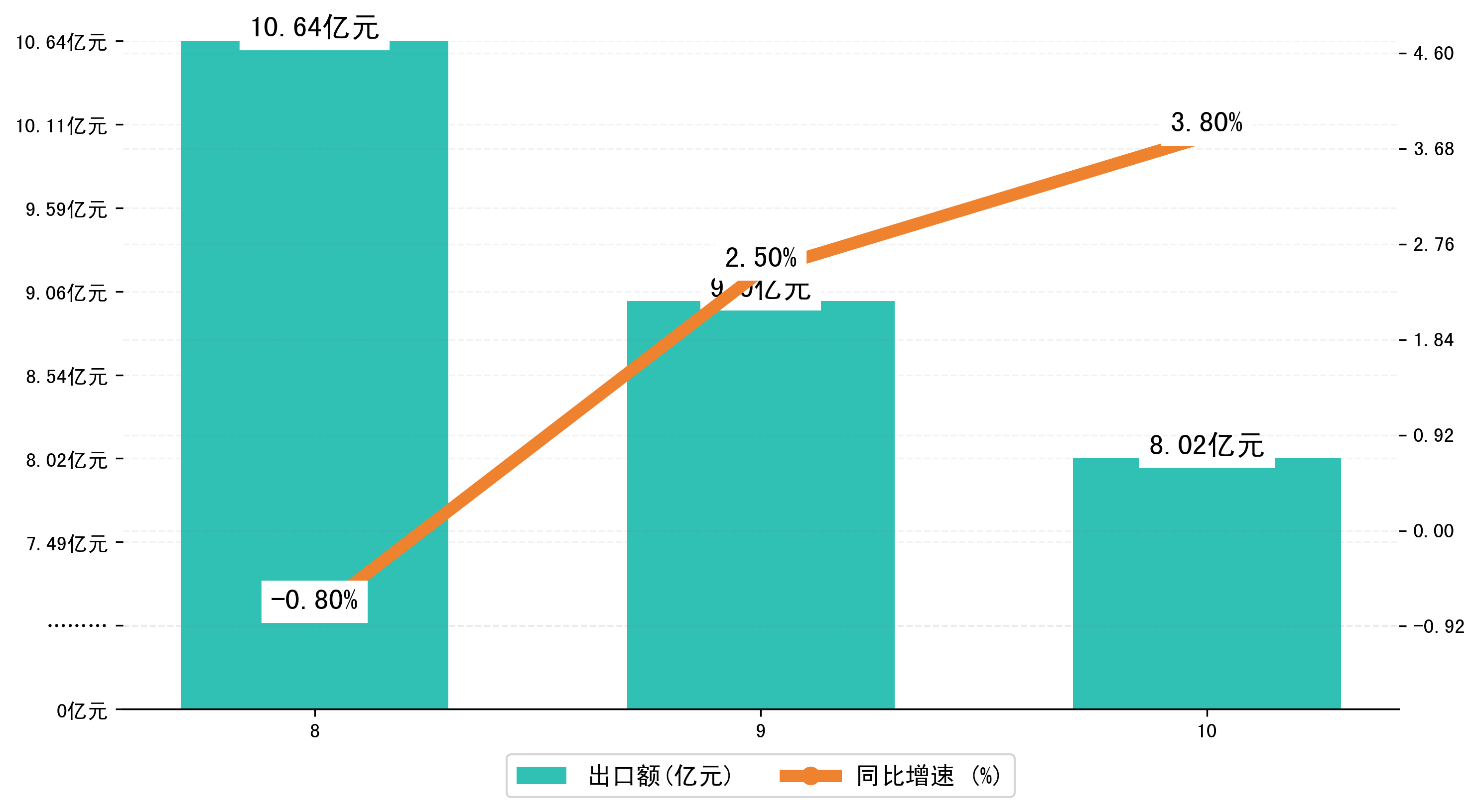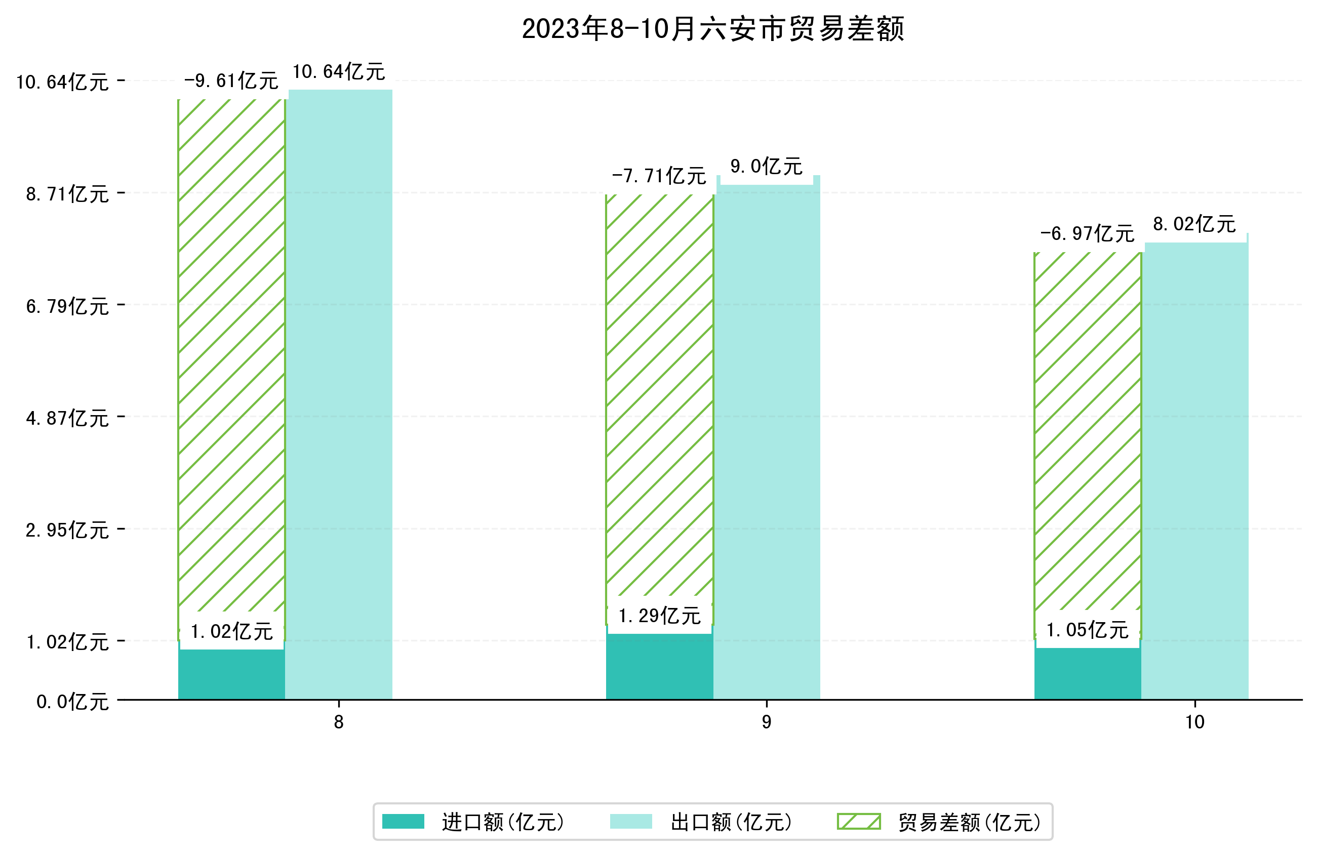 以人民币计,2023年10月六安市贸易差额为6,9667,6235万元(贸易顺差),相比上月减少了7444,7704万元,即1021,5286万美元;相比上年同期增加了5292,5910万元,同比增加8.22%。