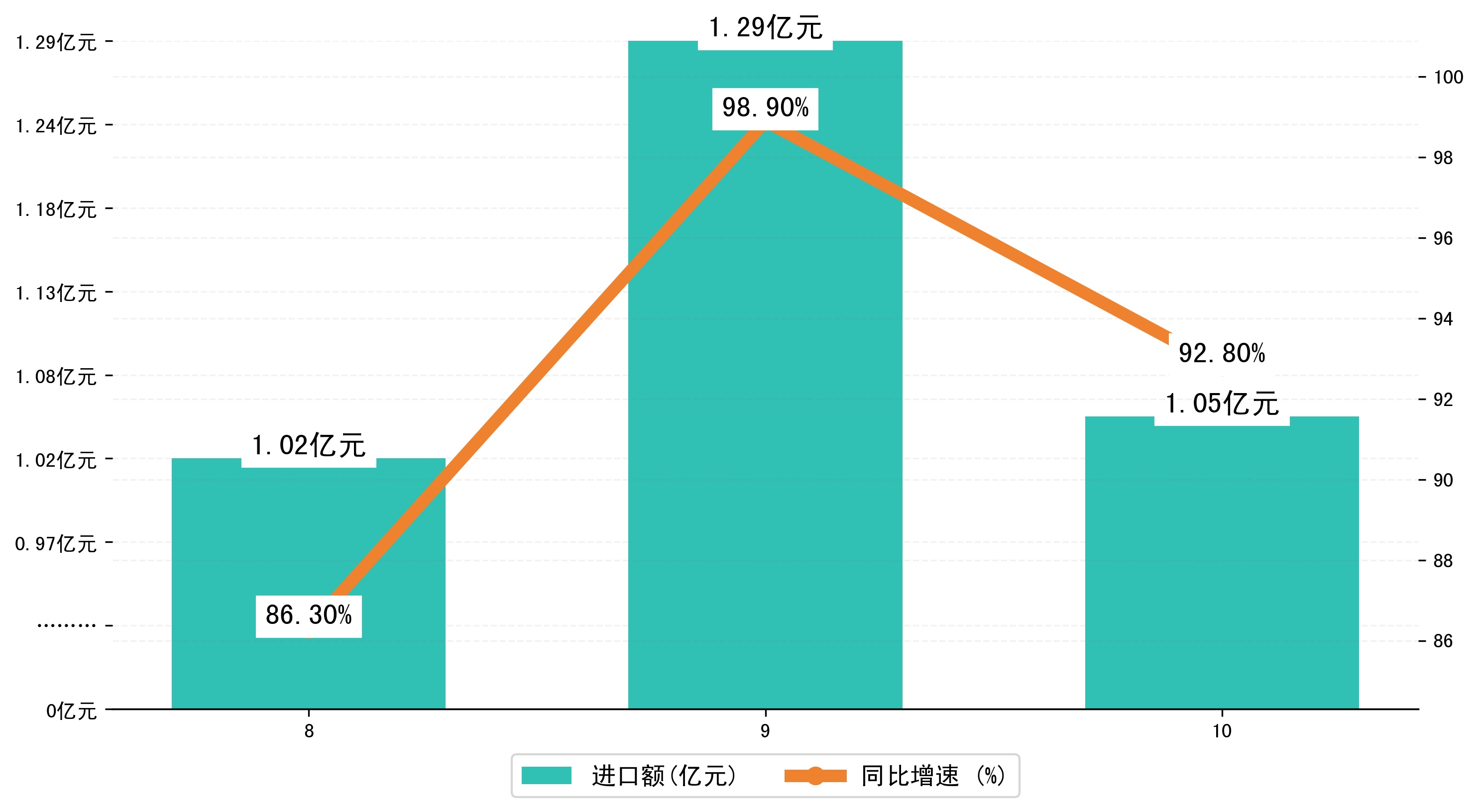 以人民币计,2023年10月六安市进口额为1,0498.0687万元,相比上月减少了2432.6897万元;相比上年同期增加了3510.3999万元,同比增加了92.80%。