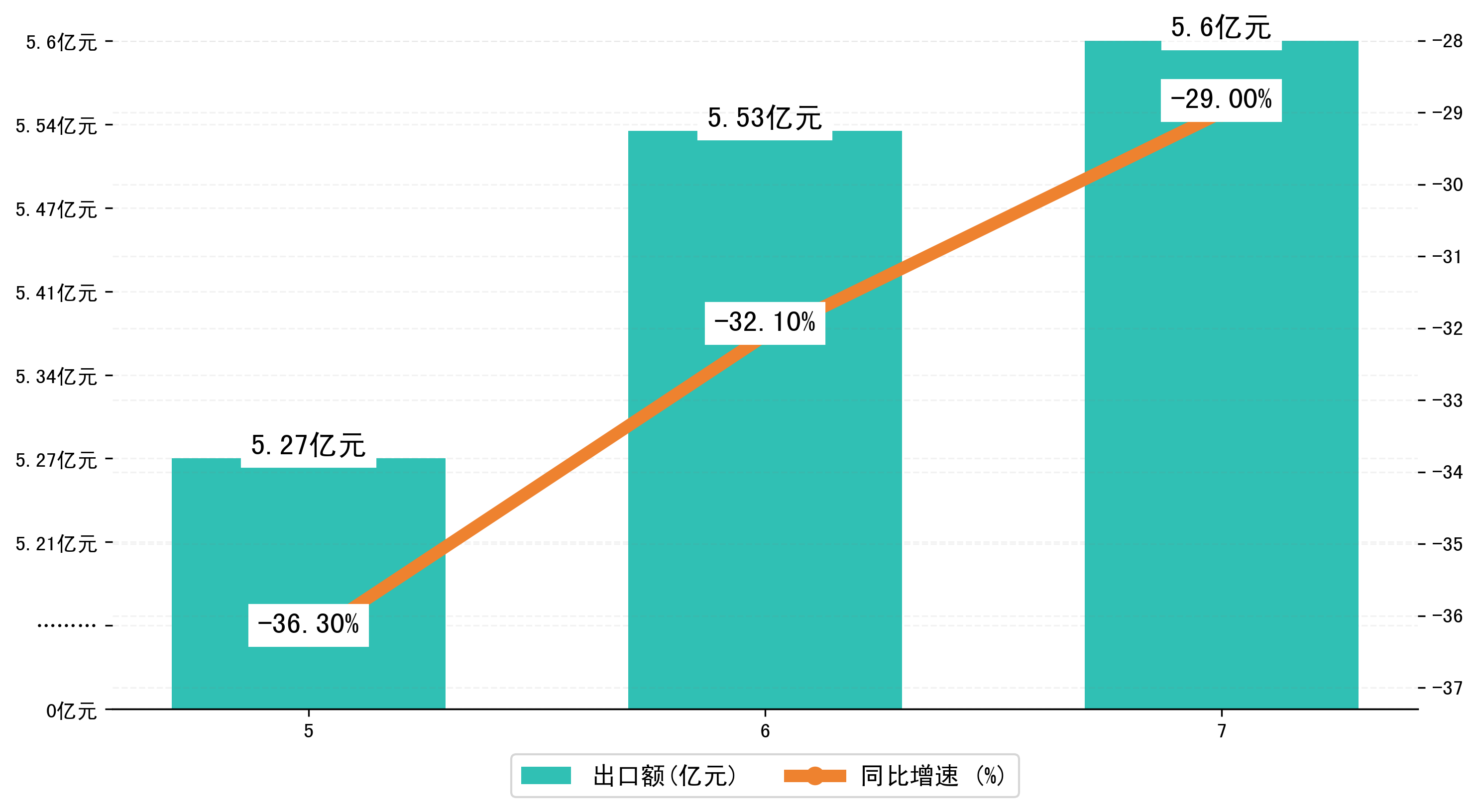 以美元计,2024年7月六安市出口额为7875.7394万美元,相比上月增加了88.9887万美元;相比上年同期减少了334.5748万美元,同比减少-30.90%。