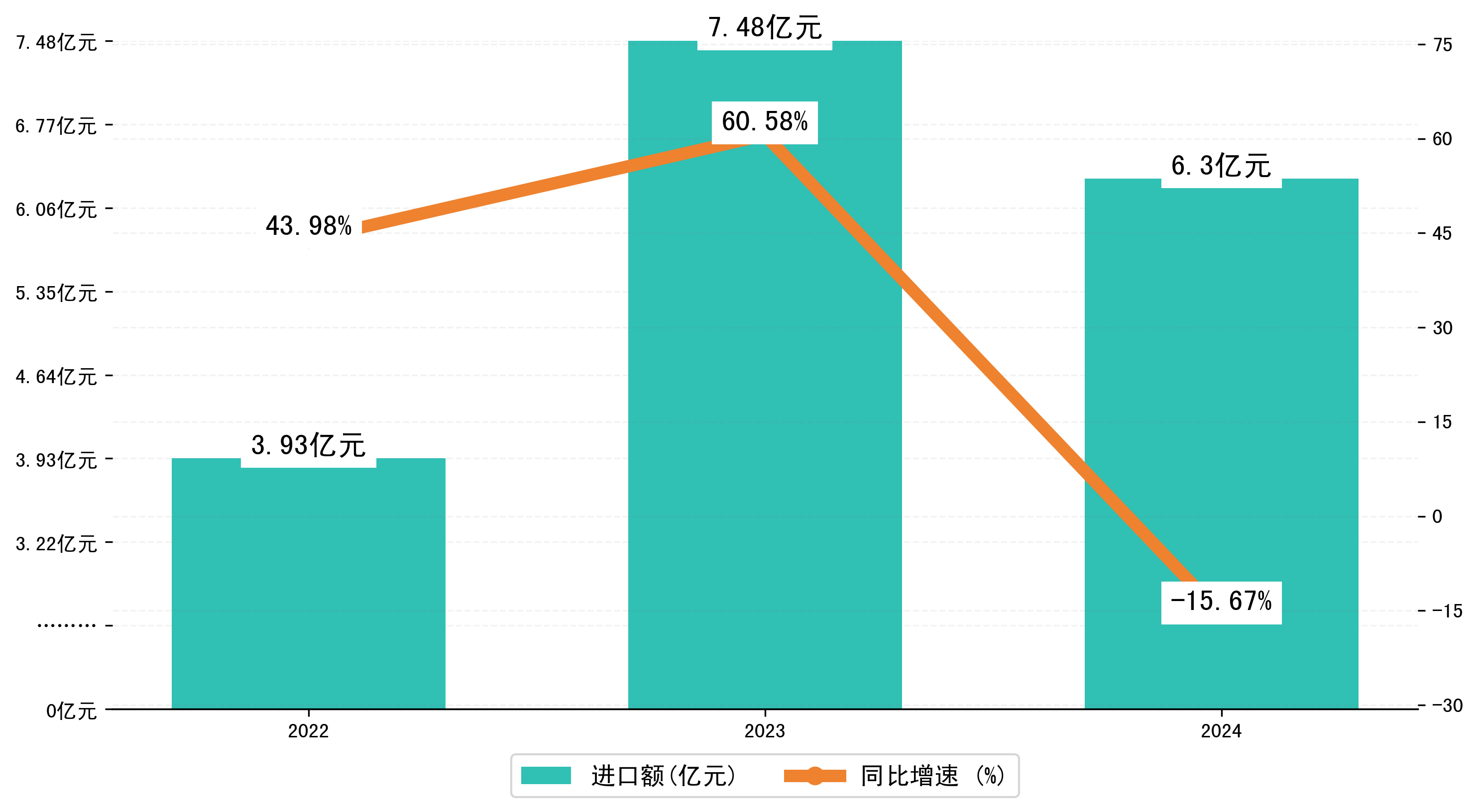 以人民币计,2024年1-7月六安市进口额为6,3046.2732万元,相比上年同期减少了1,1717.501万元,同比减少了-15.70%。