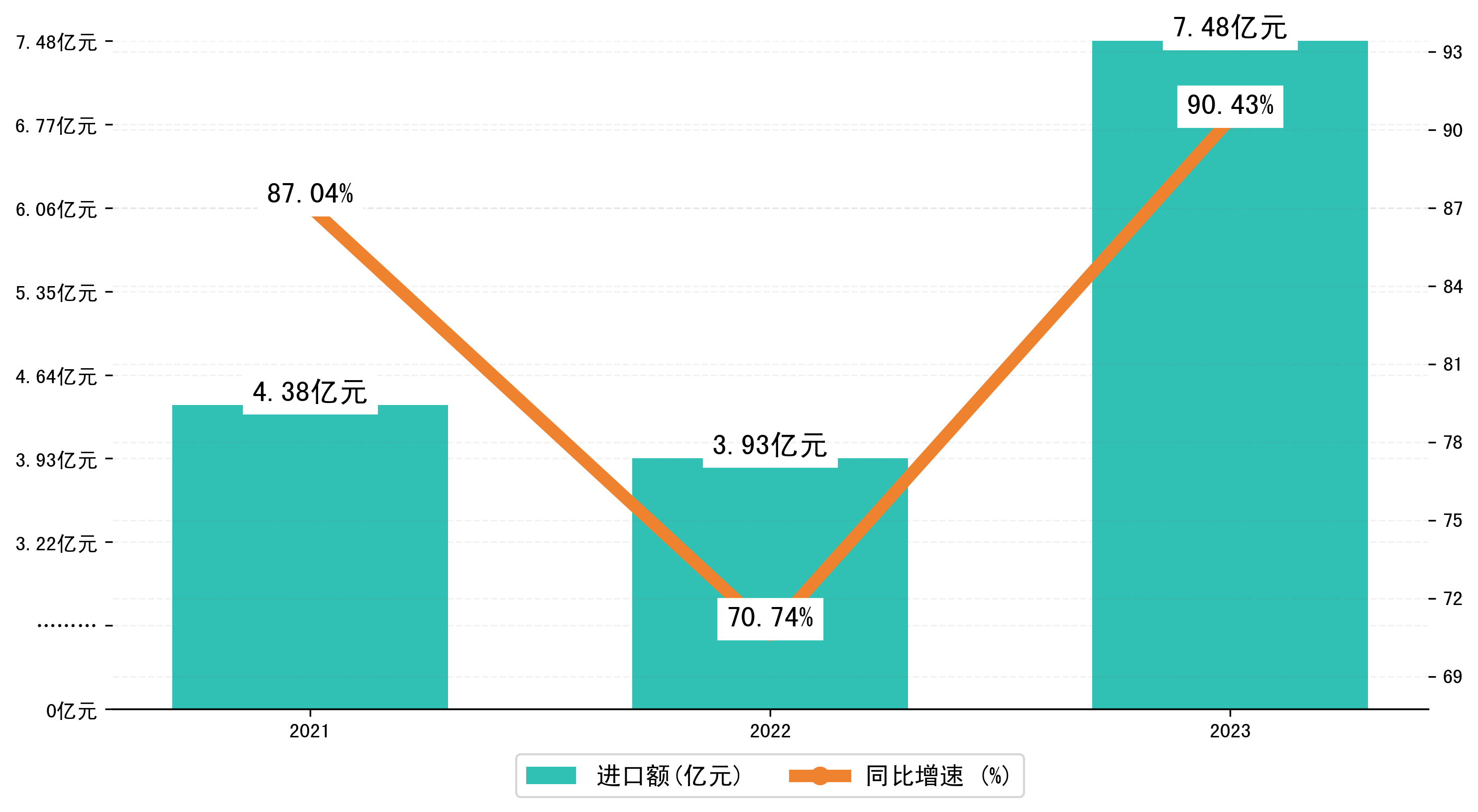 以人民币计,2023年1-7月六安市进口额为7,4763.7742万元,相比上年同期增加了3,5502.3848万元,同比增加了90.40%。