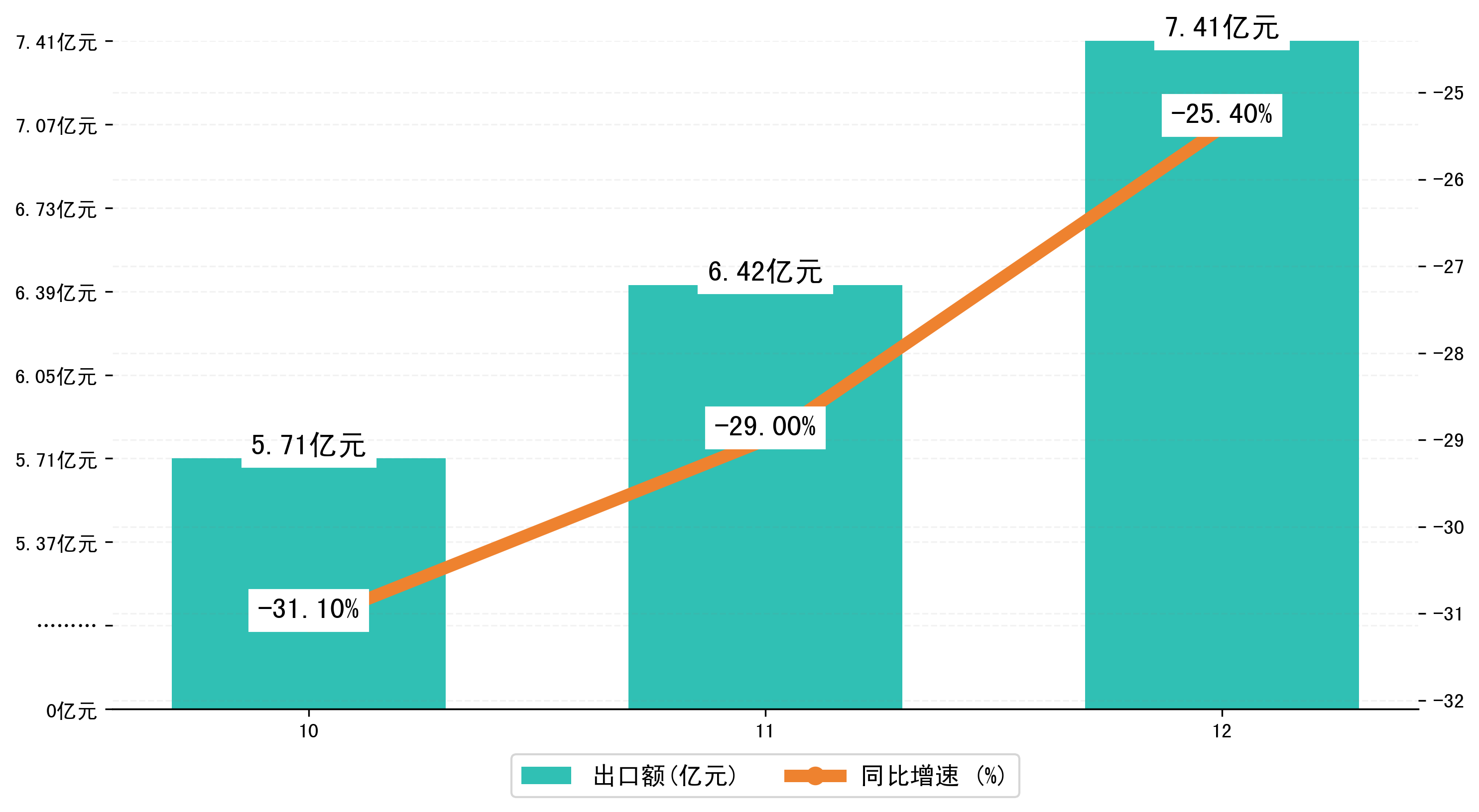 以美元计,2024年12月六安市出口额为1,0318.4144万美元,相比上月增加了1297.049万美元;相比上年同期增加了2264.2956万美元,同比减少-26.40%。