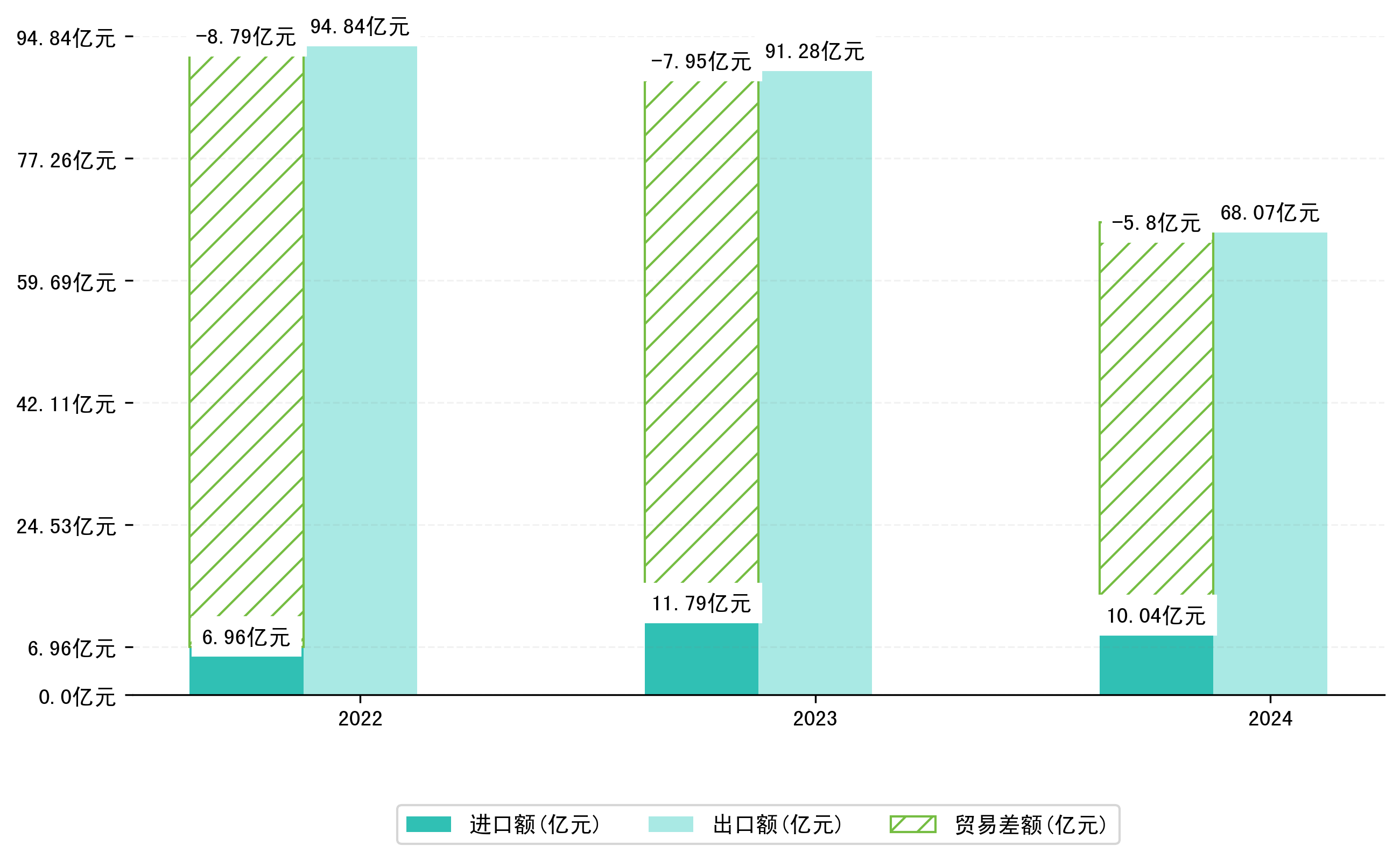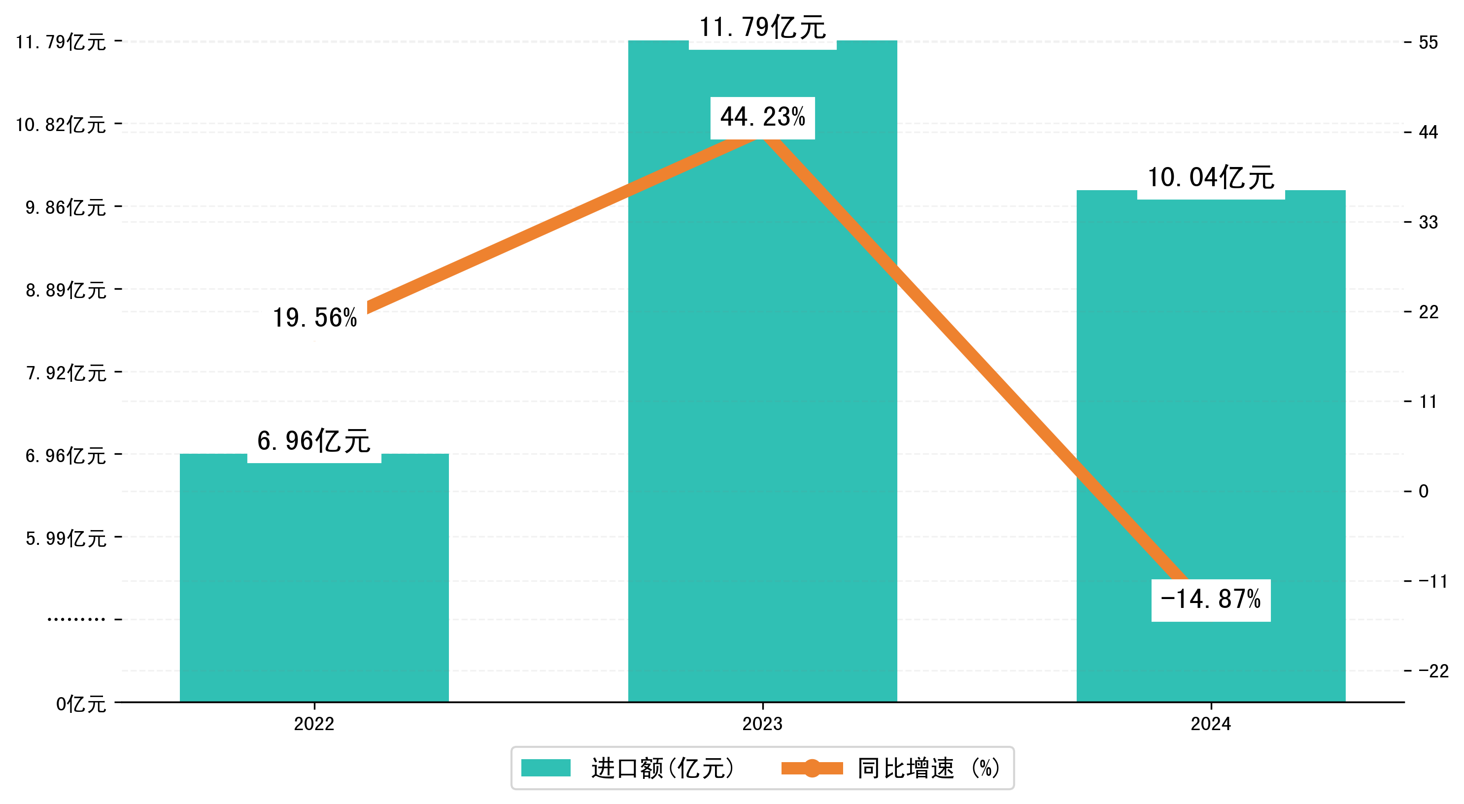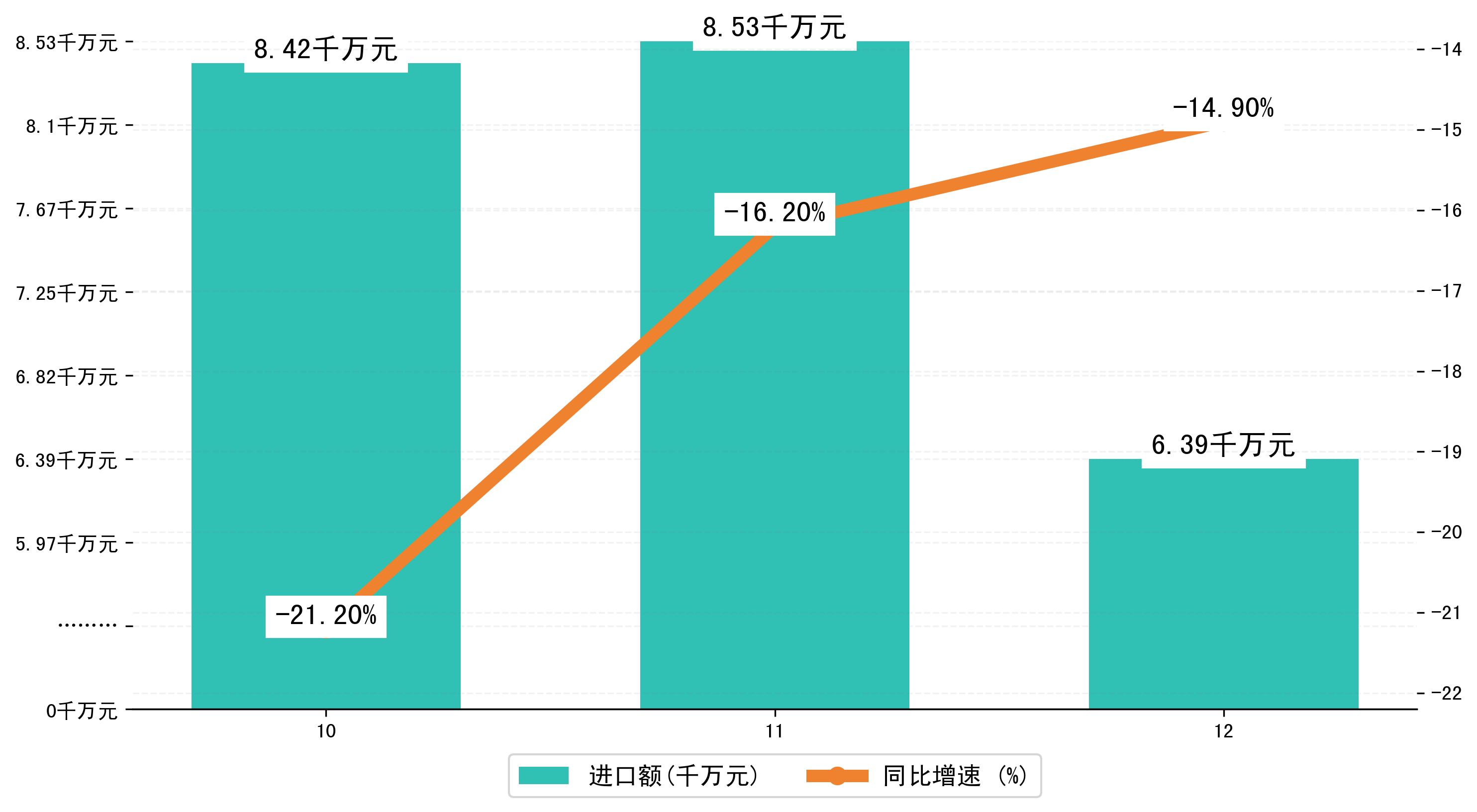 以人民币计,2024年1-12月六安市进口额为10,0357.4771万元,相比上年同期减少了1,7531.7621万元,同比减少了-14.90%。
