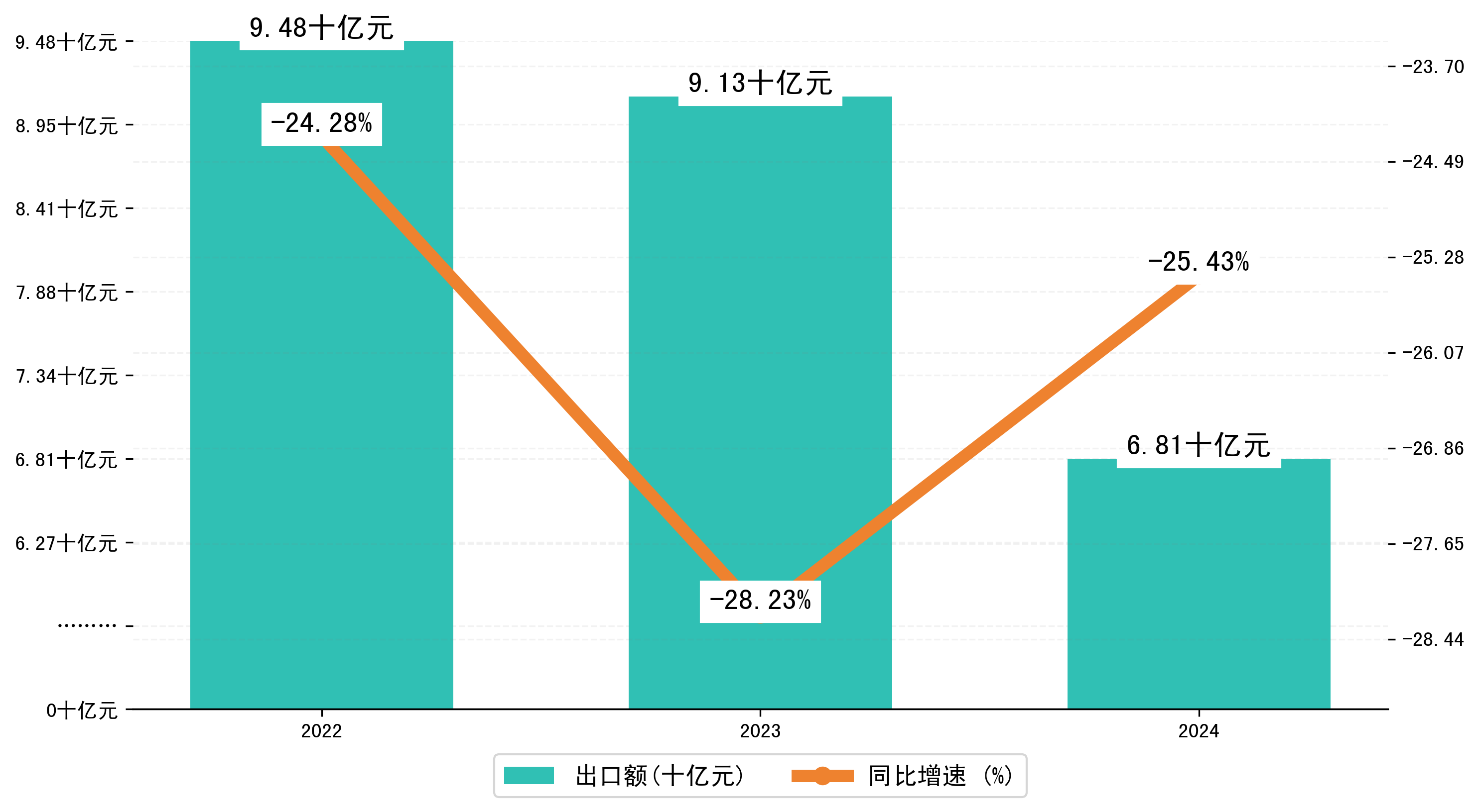 以美元计,2024年1-12月六安市出口额为9,5630.0037万美元,相比上年同期减少了3,4371.129万美元,同比减少-26.40%。