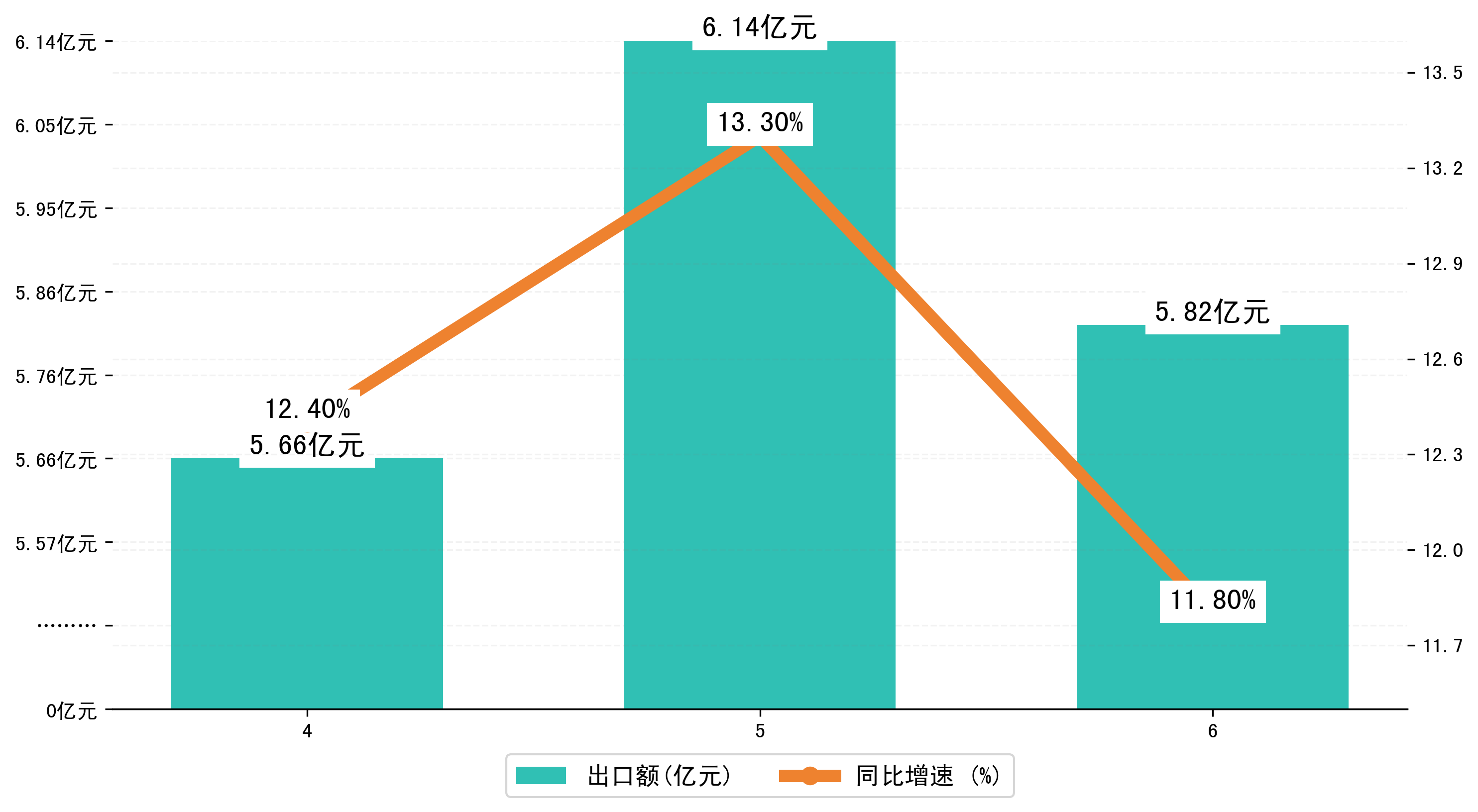 以人民币计,2025年1-6月六安市出口额为34,3591.2611万元,相比上年同期增加了3,6175.4304万元,同比增加了11.80%。