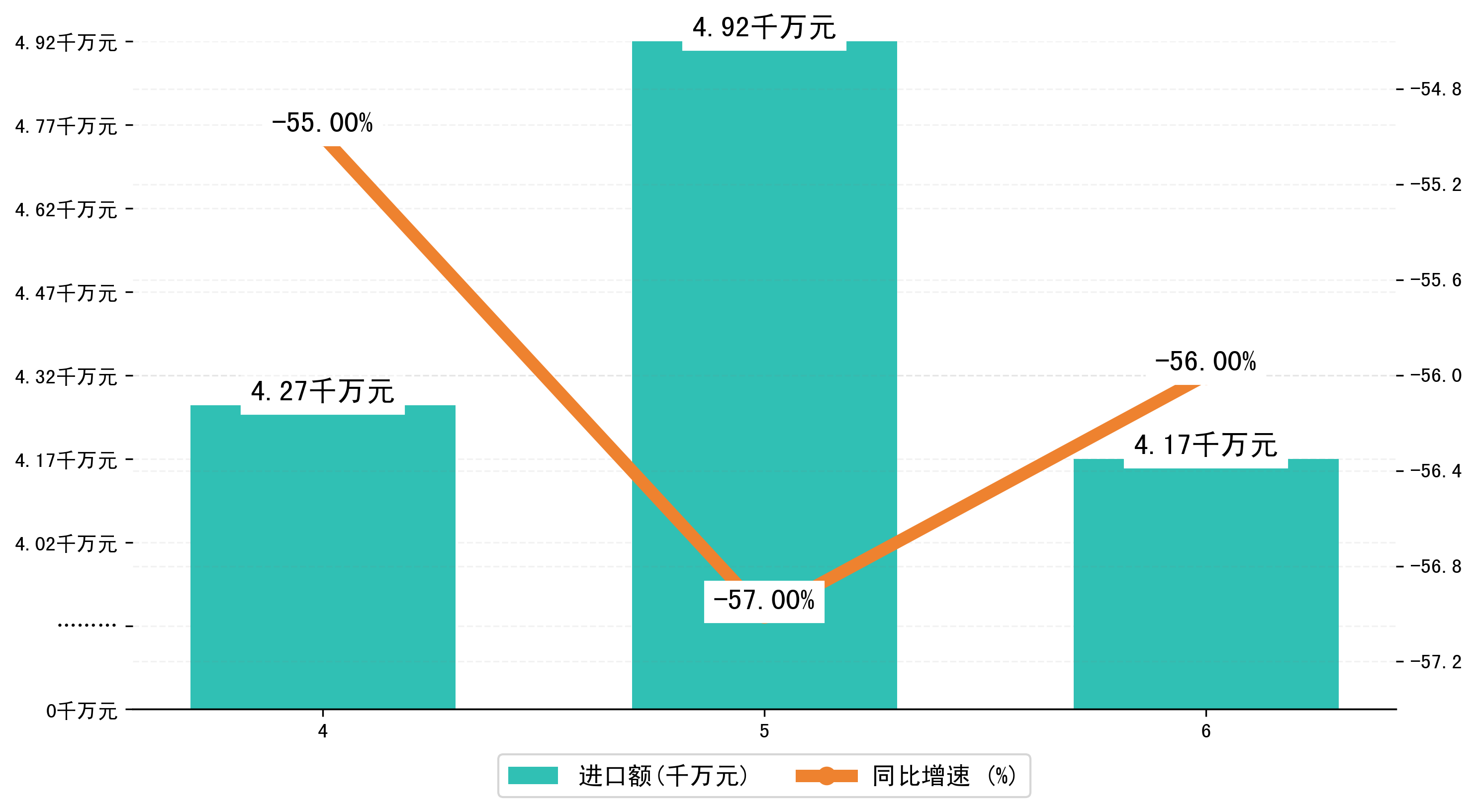 以人民币计,2025年6月六安市进口额为4170.0532万元,相比上月减少了753.7969万元;相比上年同期减少了4202.0893万元,同比减少了-56.00%。