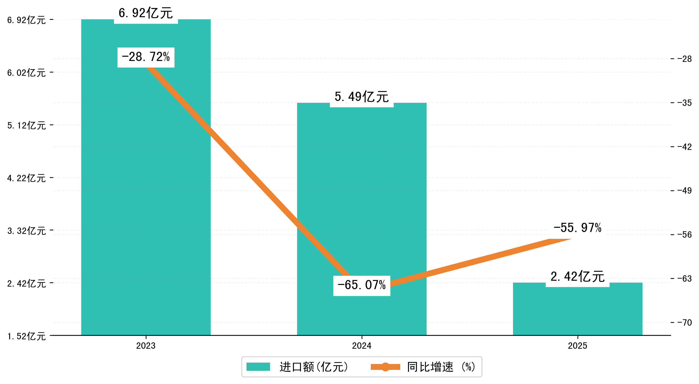 以美元计,2025年1-6月六安市进口额为3363.7873万美元,相比上年同期减少了4365.6833万美元,同比减少-56.50%。