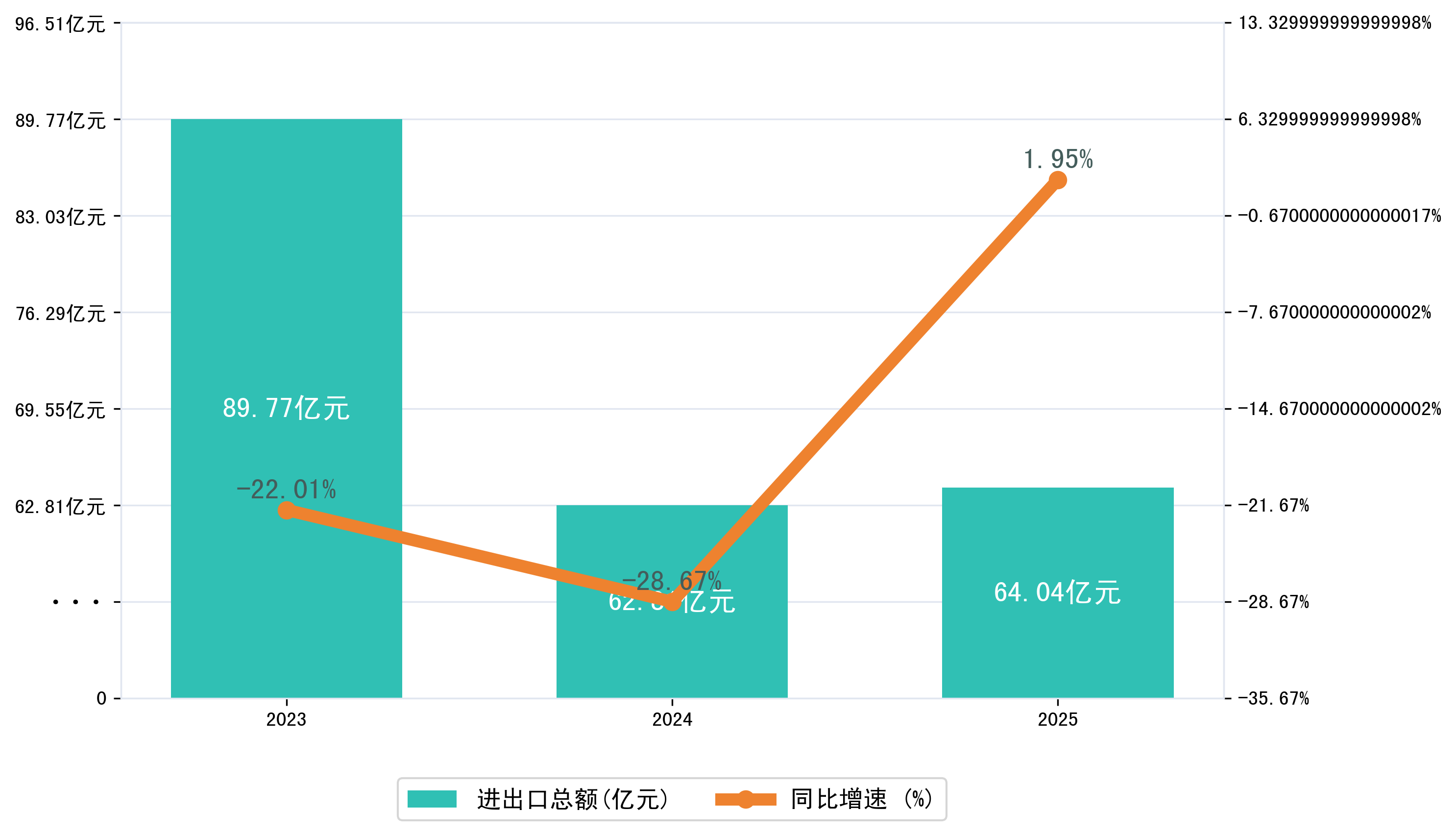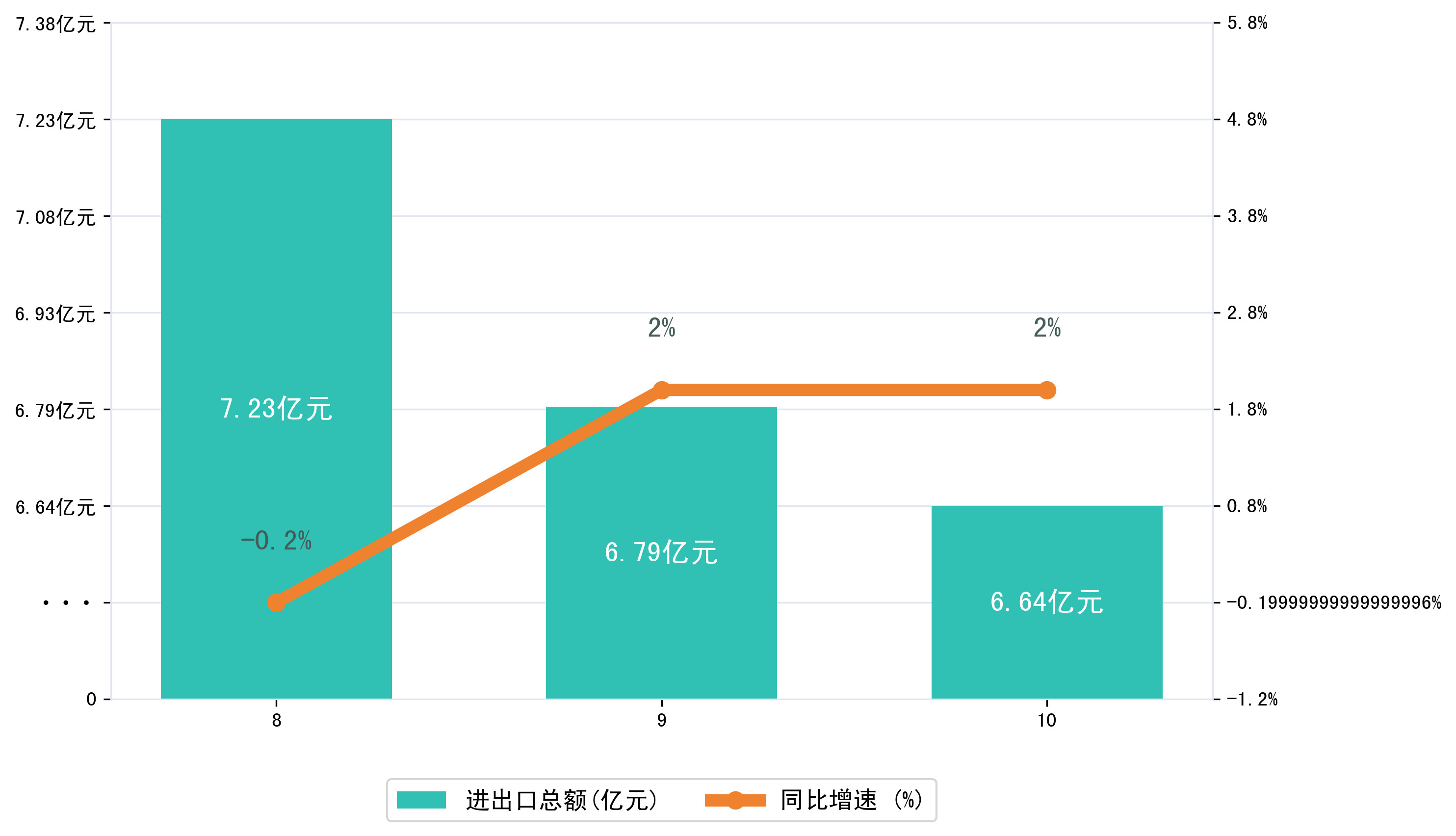 以人民币计,2025年1-10月六安市进出口总额为64,0357.5055万元,相比上年同期增加了1,2251.0615万元,同比增加了2.00%。