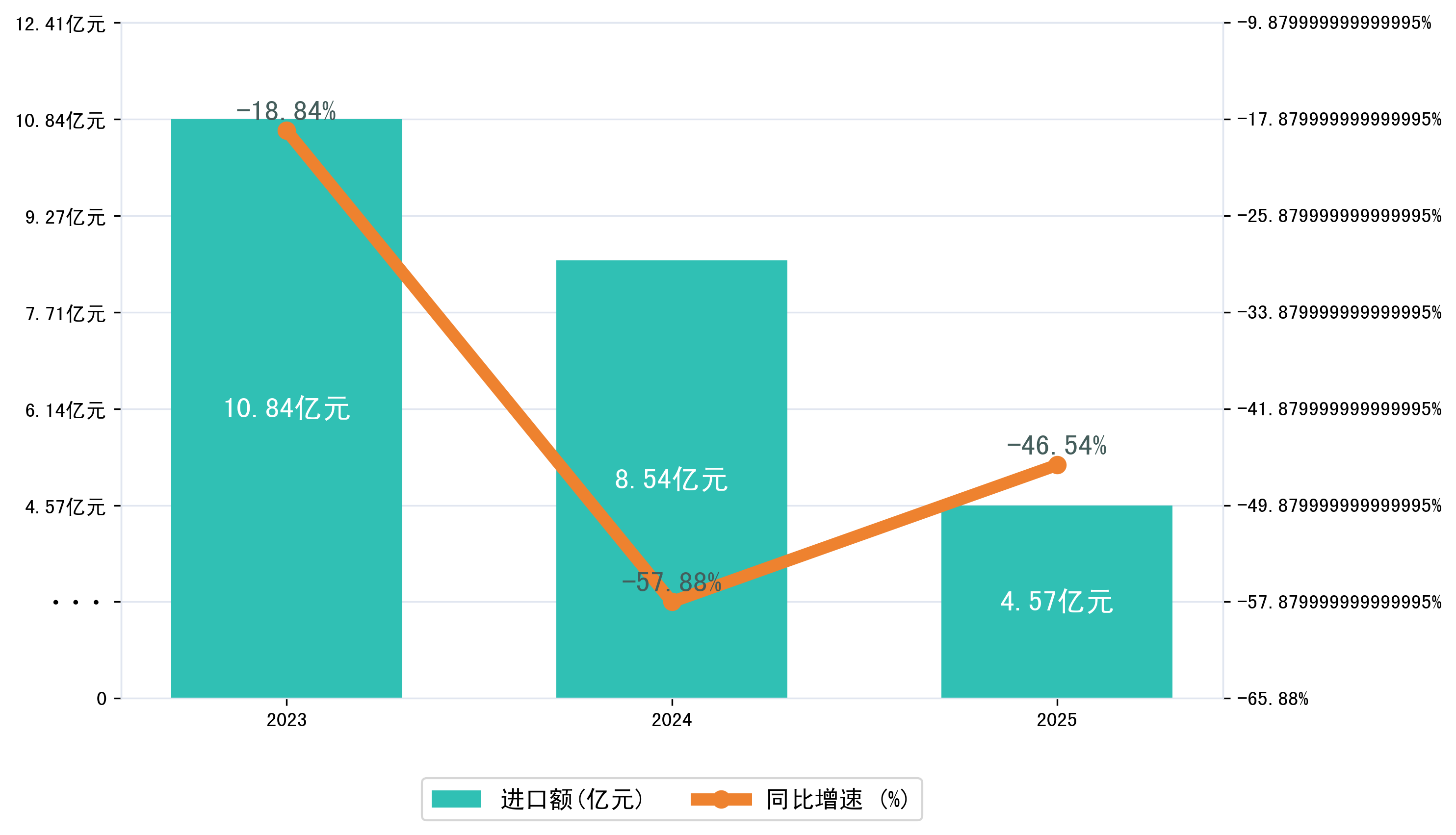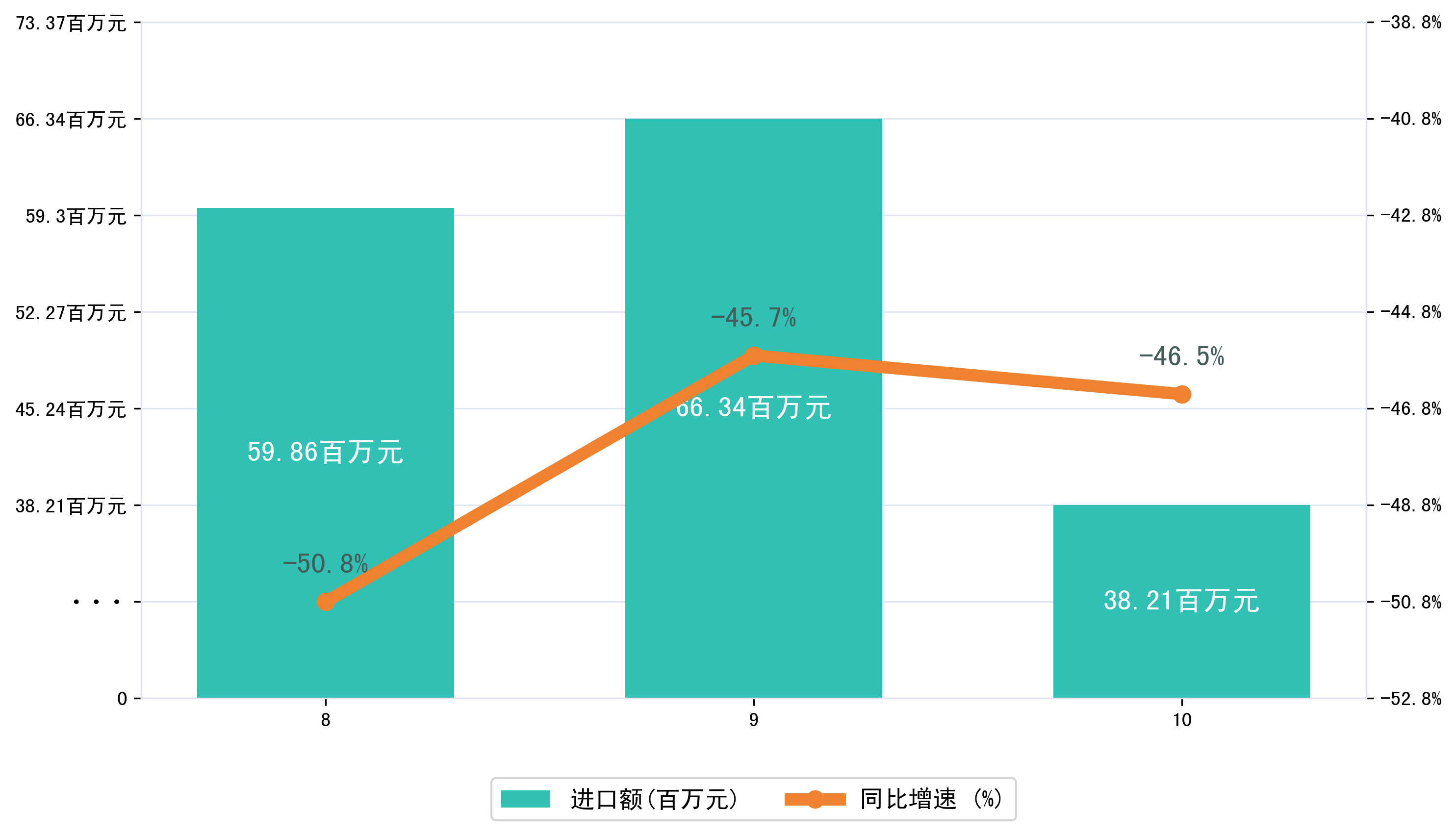 以人民币计,2025年10月六安市进口额为3820.6218万元,相比上月减少了2813.0238万元;相比上年同期减少了4594.9204万元,同比减少了-46.50%。