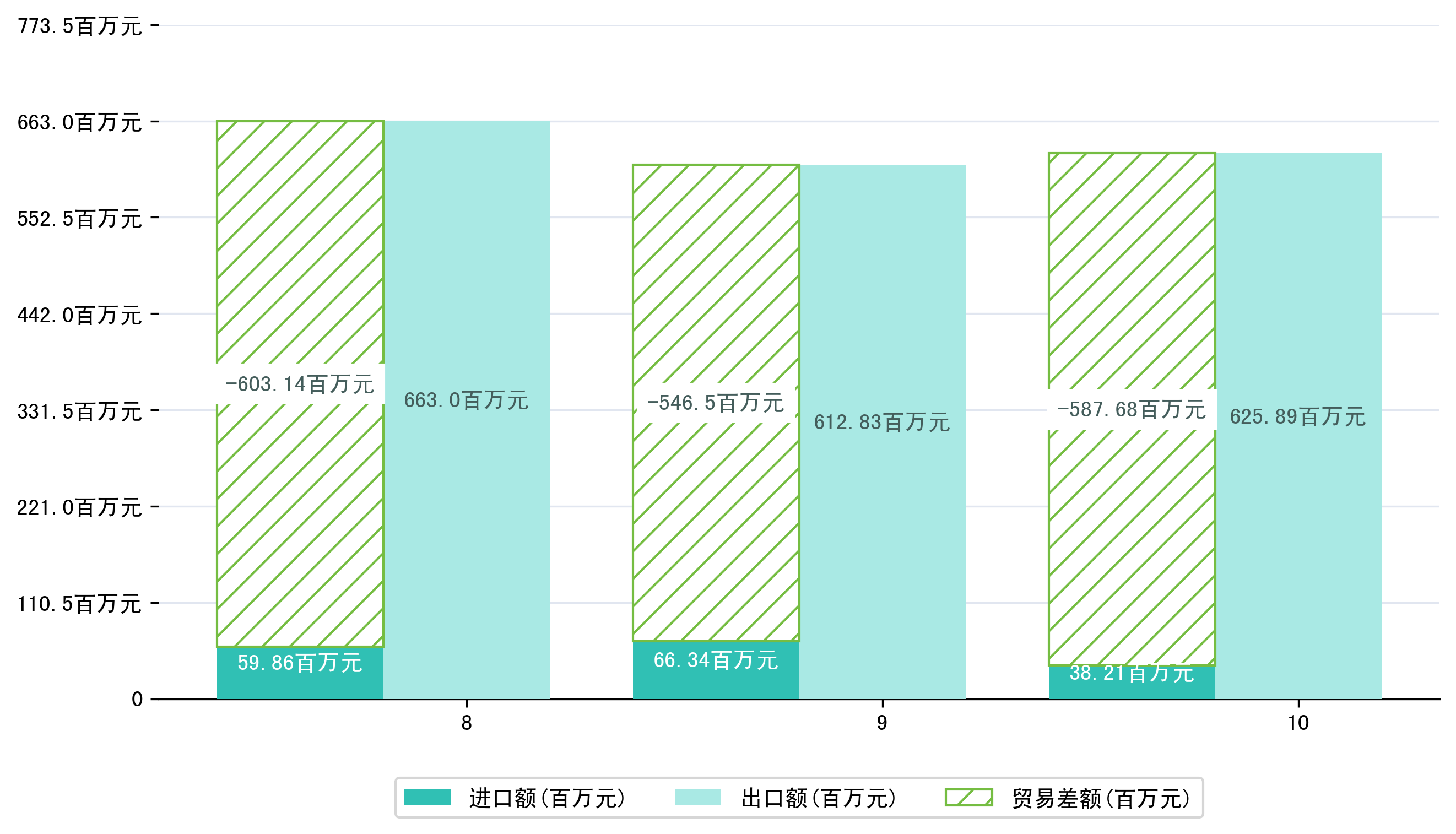 以人民币计,2025年10月六安市贸易差额为5,8768,3018万元(贸易顺差),相比上月增加了4118,5925万元,即607,7588万美元;相比上年同期增加了1,0071,6962万元,同比增加20.68%。