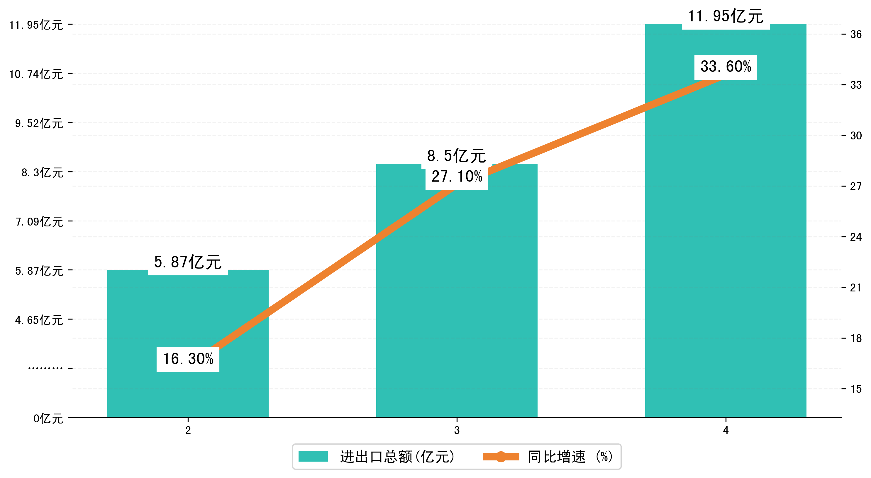 以人民币计,2023年4月六安市进出口总额为11,9516.0299万元,相比上月增加了3,4527.4399万元;相比上年同期增加了3,7852.1245万元,同比增加了33.60%。