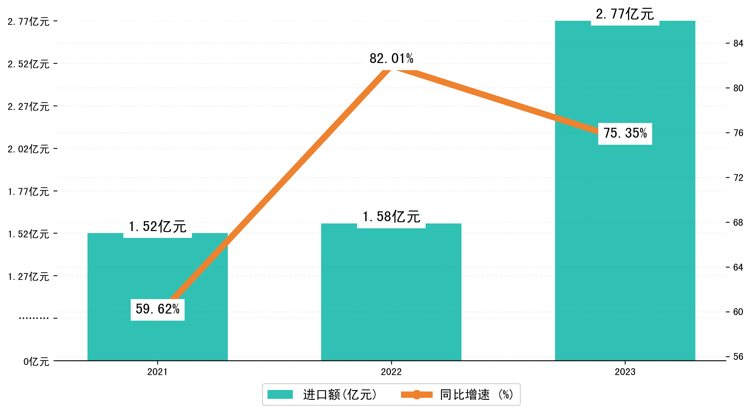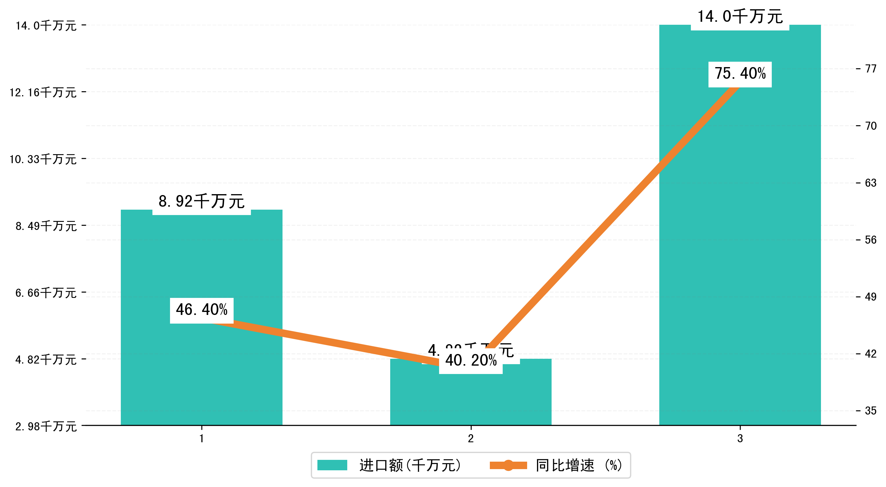 以人民币计,2023年1-3月六安市进口额为2,7740.7595万元,相比上年同期增加了1,1920.8835万元,同比增加了75.40%。