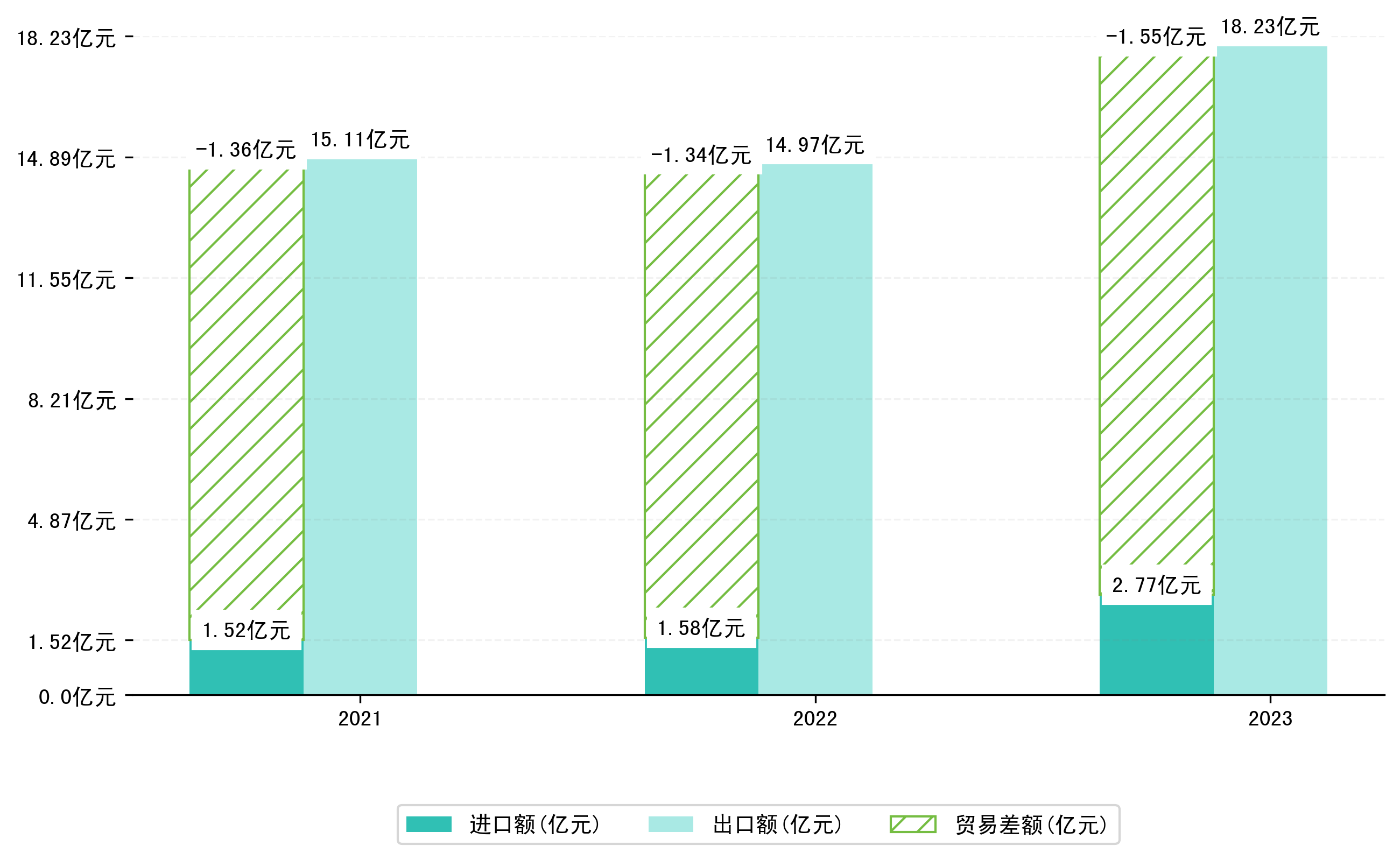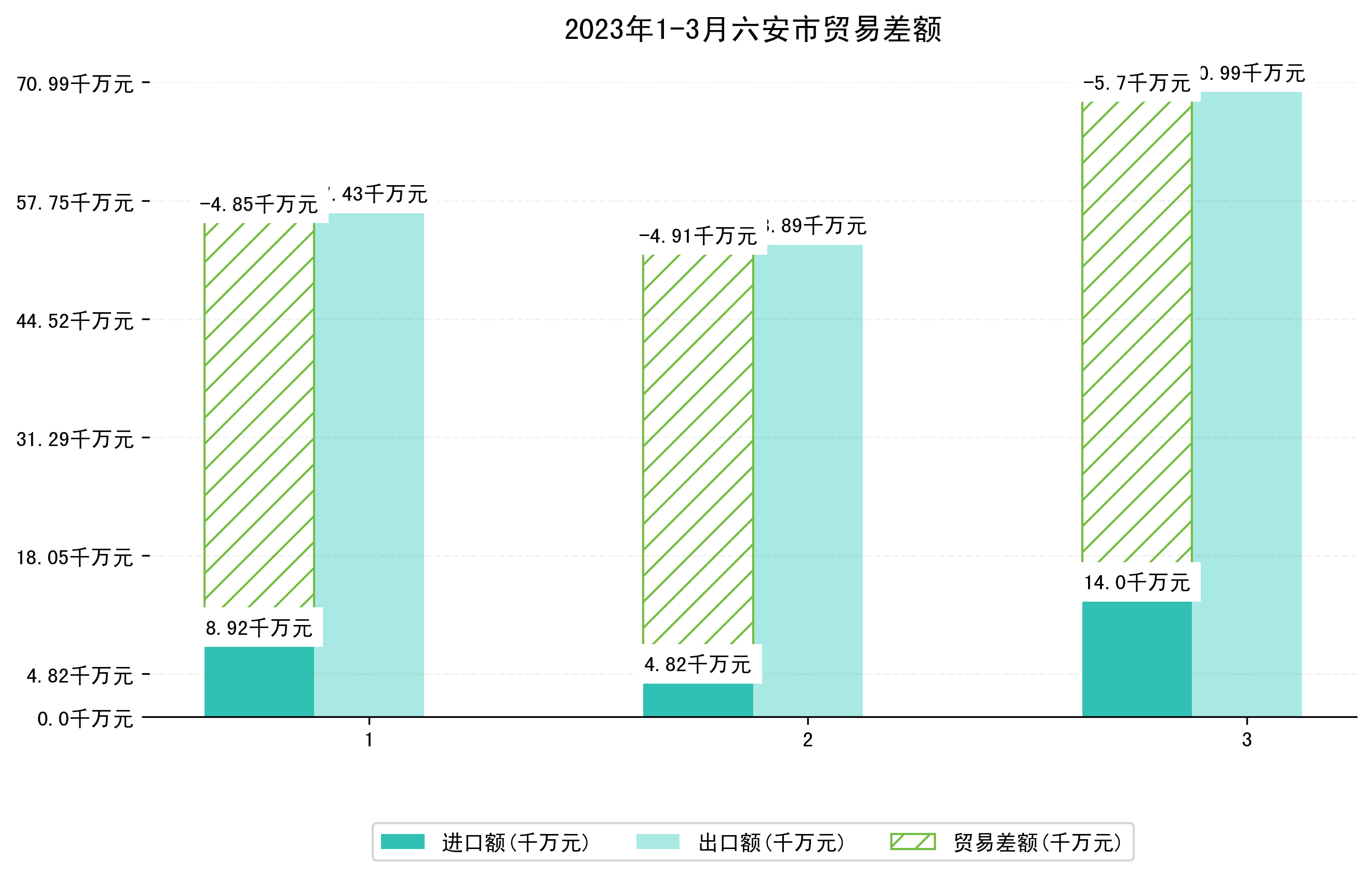以人民币计,2023年1-3月六安市贸易差额为15,4568,0440万元(贸易顺差),相比上年同期增加了2,0731,2494万元,同比增加15.49%。