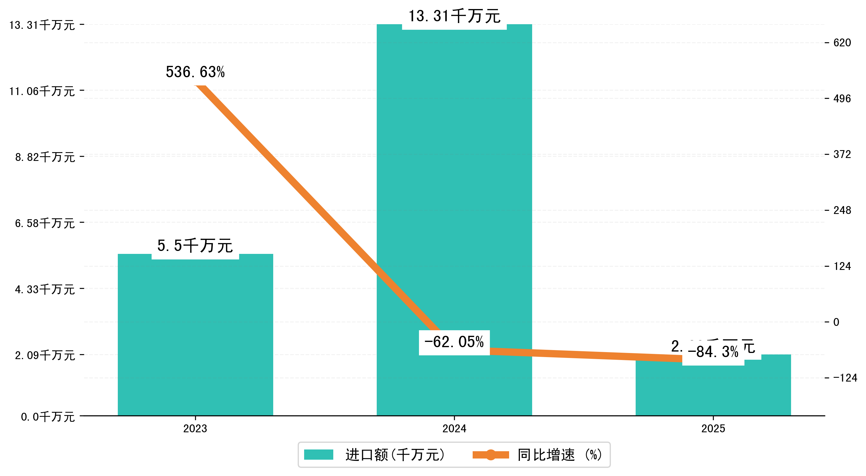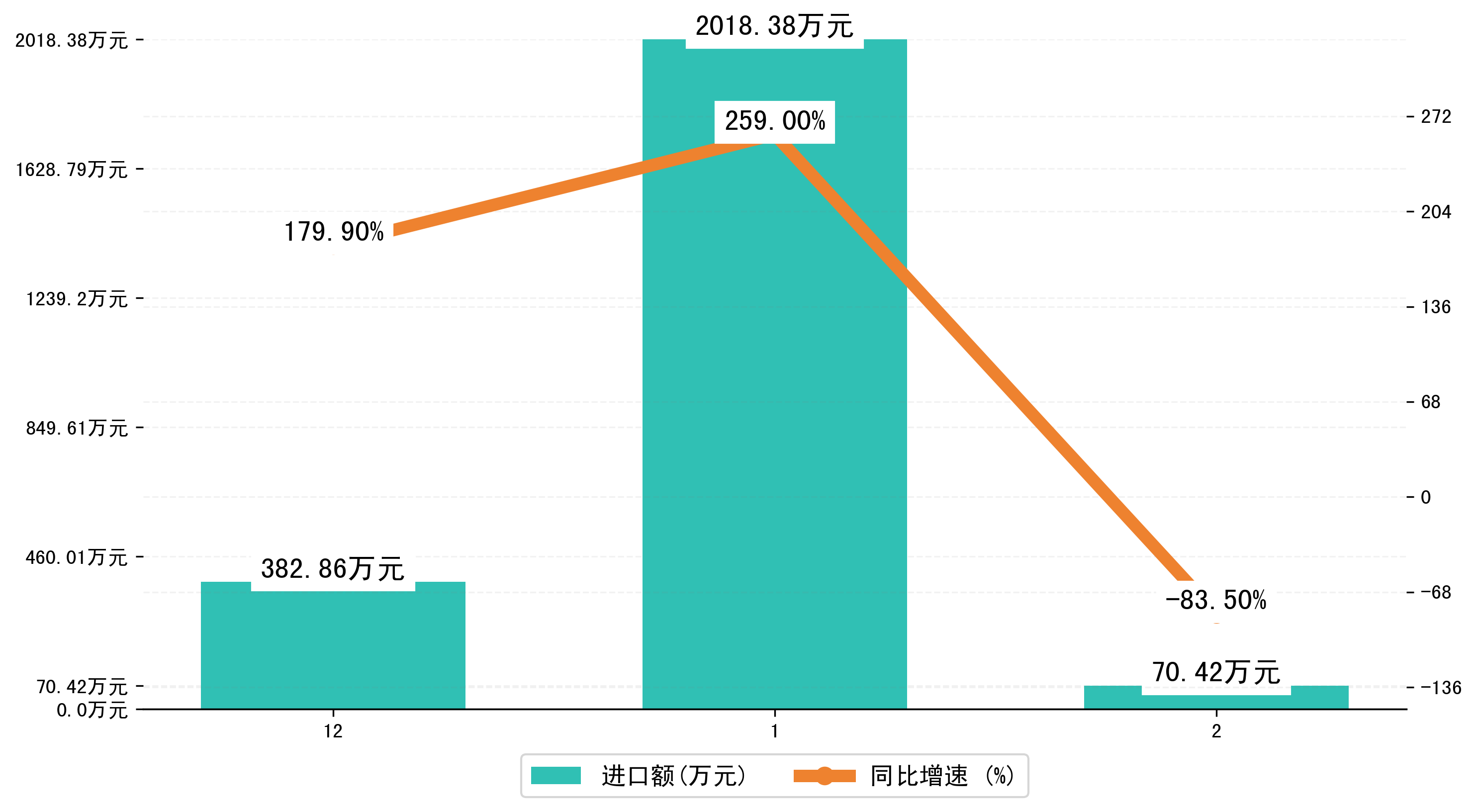 以人民币计,2025年1-2月长治市进口额为2088.8055万元,相比上年同期减少了1,1219.582万元,同比减少了-83.50%。
