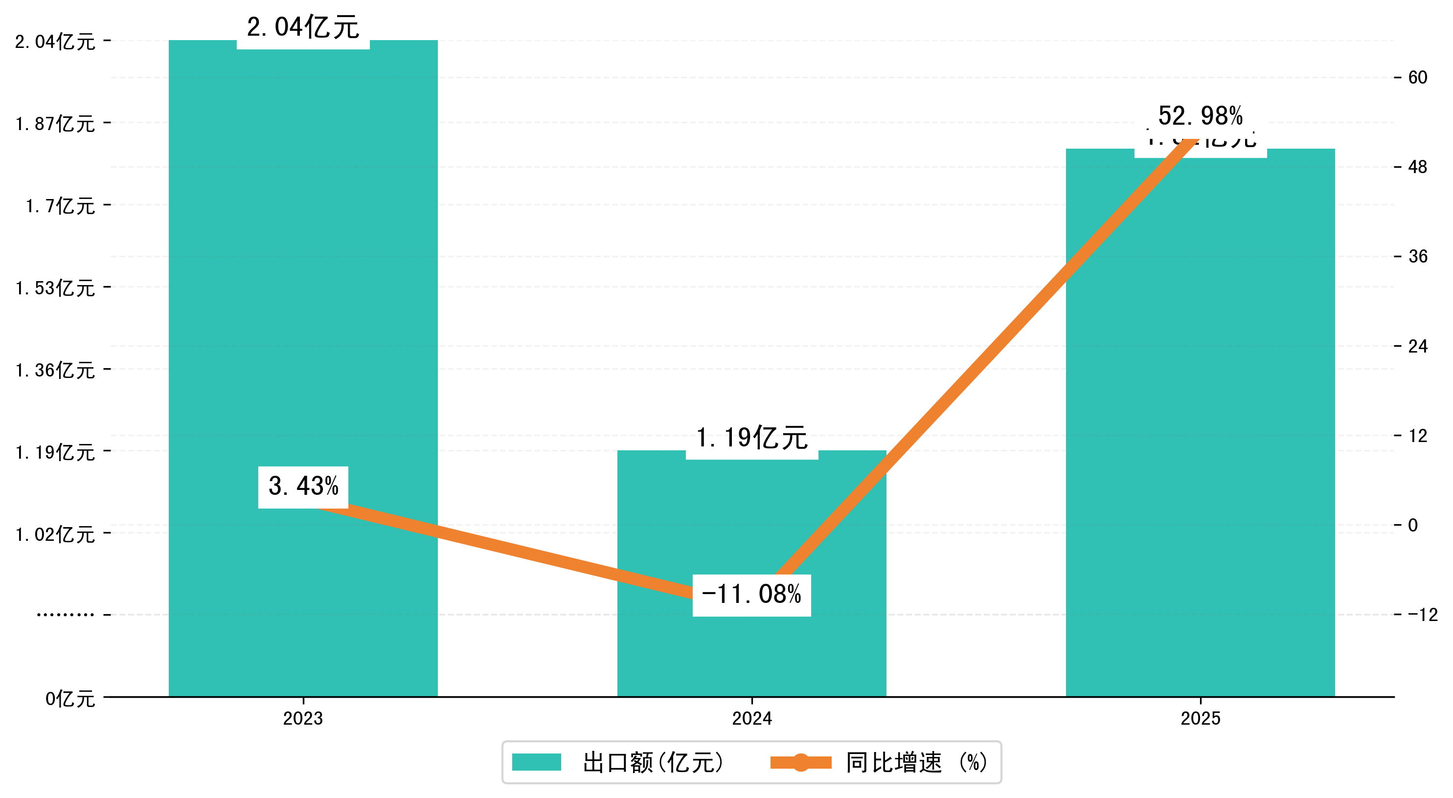 以美元计,2025年1-2月长治市出口额为2529.4042万美元,相比上年同期增加了856.623万美元,同比增加51.20%。