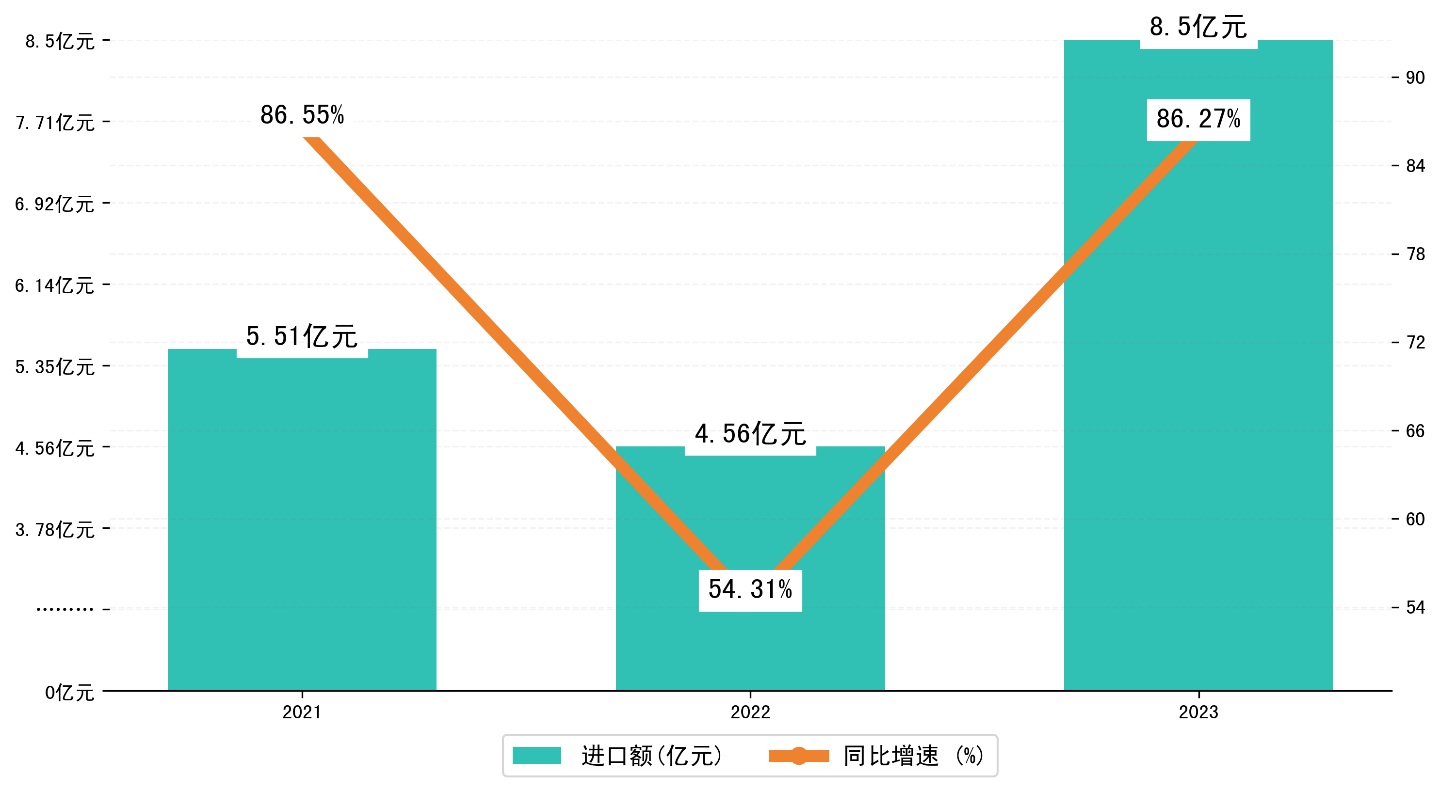 以人民币计,2023年1-8月六安市进口额为8,4991.2967万元,相比上年同期增加了3,9362.6581万元,同比增加了86.30%。