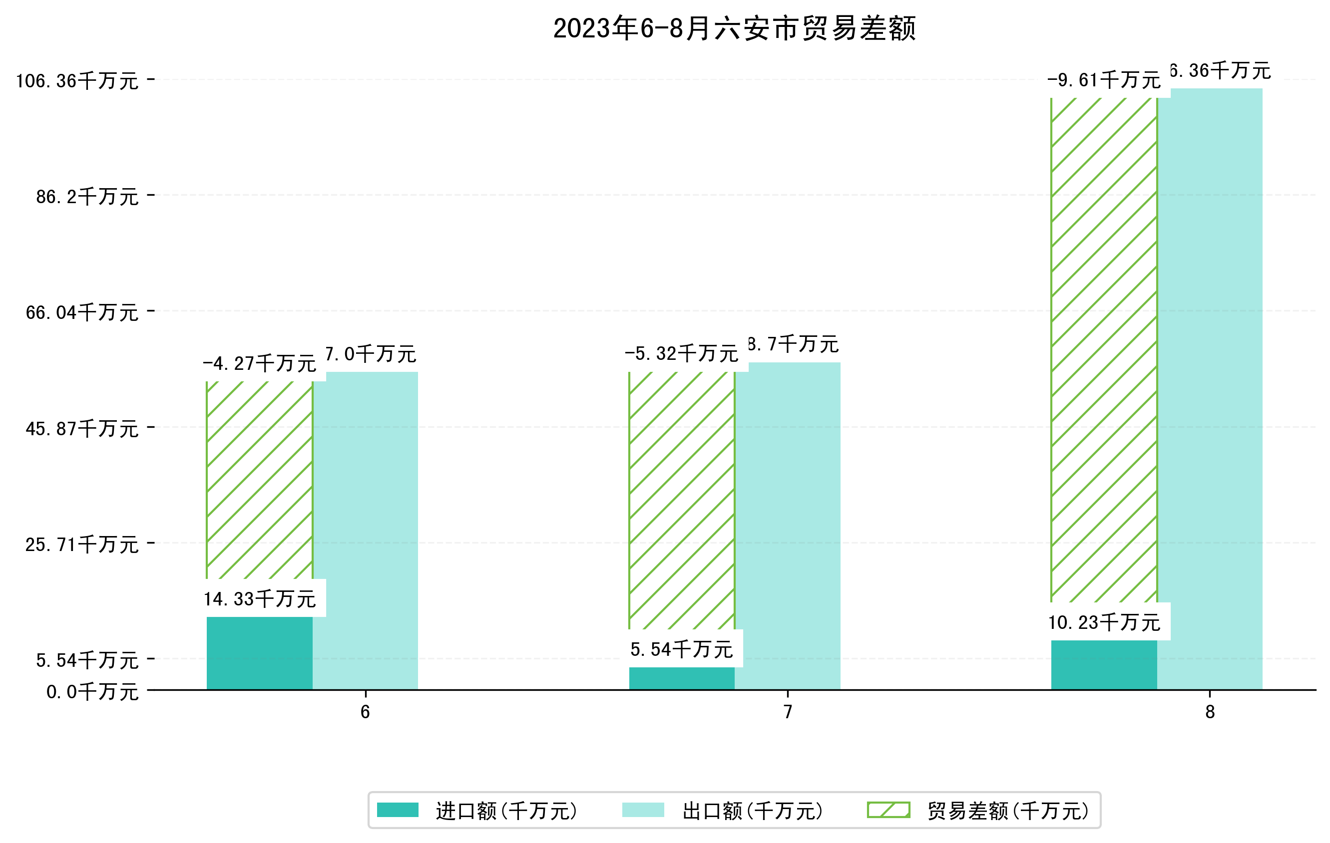 以人民币计,2023年8月六安市贸易差额为9,6137,2889万元(贸易顺差),相比上月增加了4,2976,3089万元,即6013,2707万美元;相比上年同期减少了1,3864,6561万元,同比减少-12.6%。
