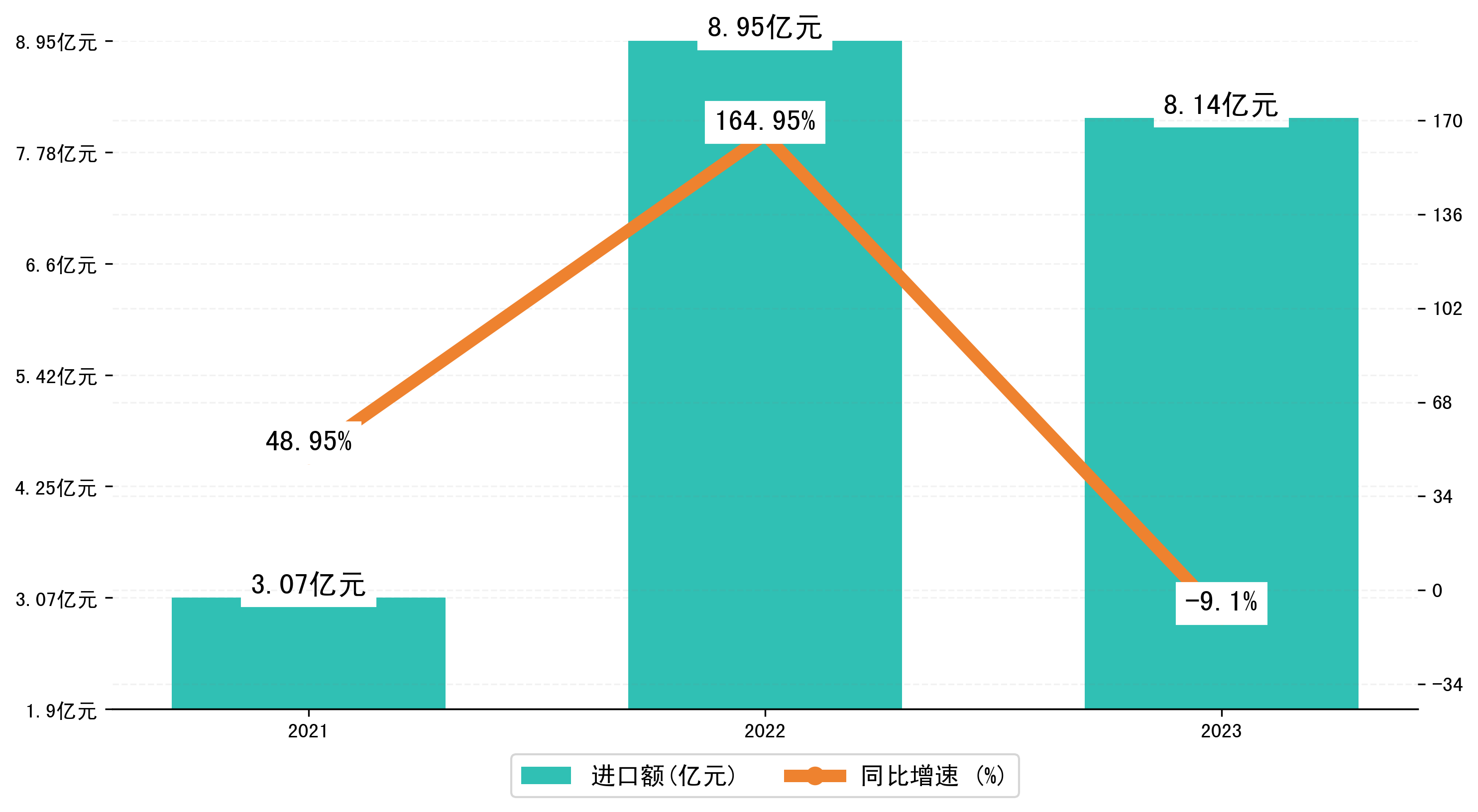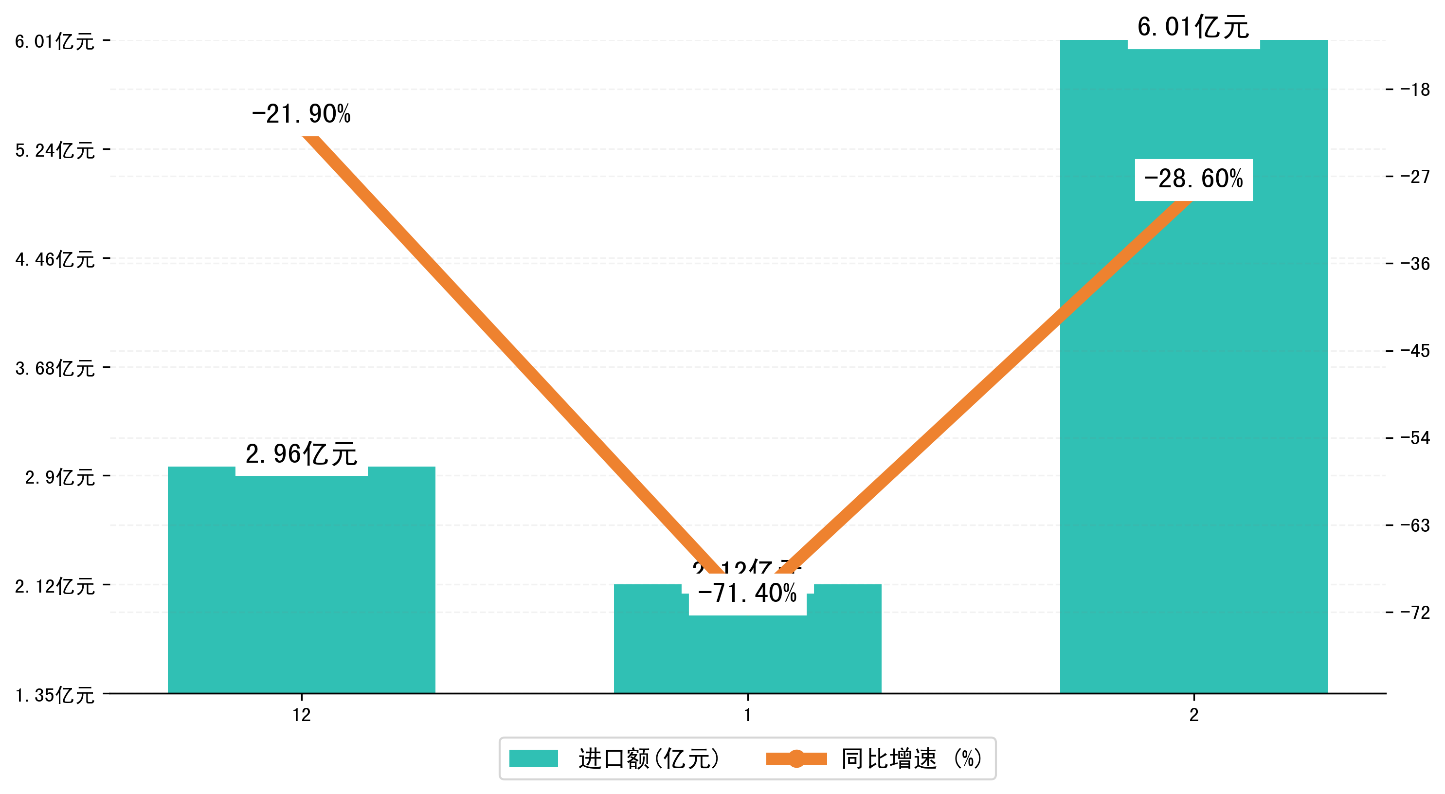 以人民币计,2023年1-2月洛阳市进口额为8,1371.7298万元,相比上年同期减少了8146.2075万元,同比减少了-28.60%。