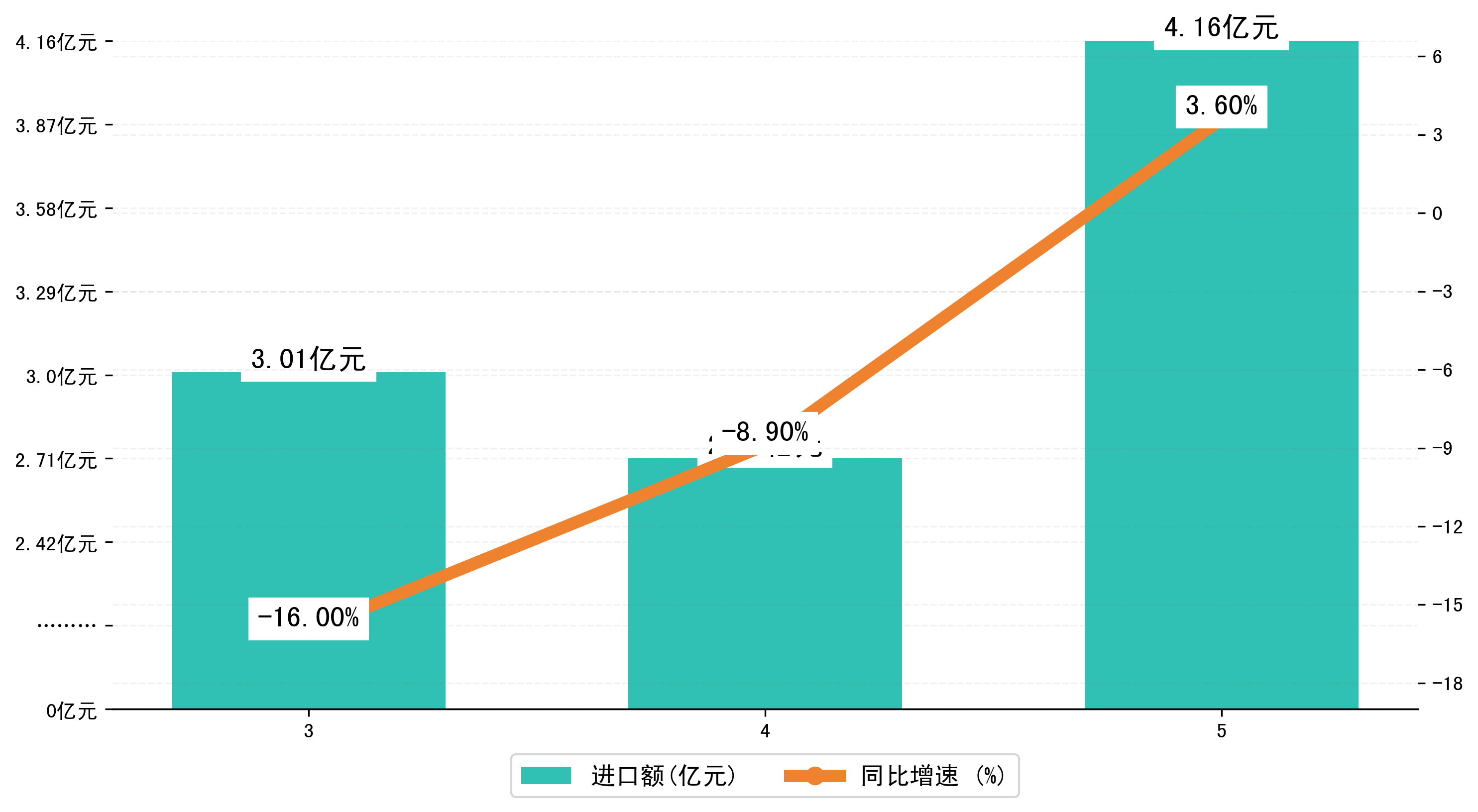 以美元计,2023年1-5月洛阳市进口额为2,6391.8217万美元,相比上年同期减少了4125.7551万美元,同比增加-3.40%。