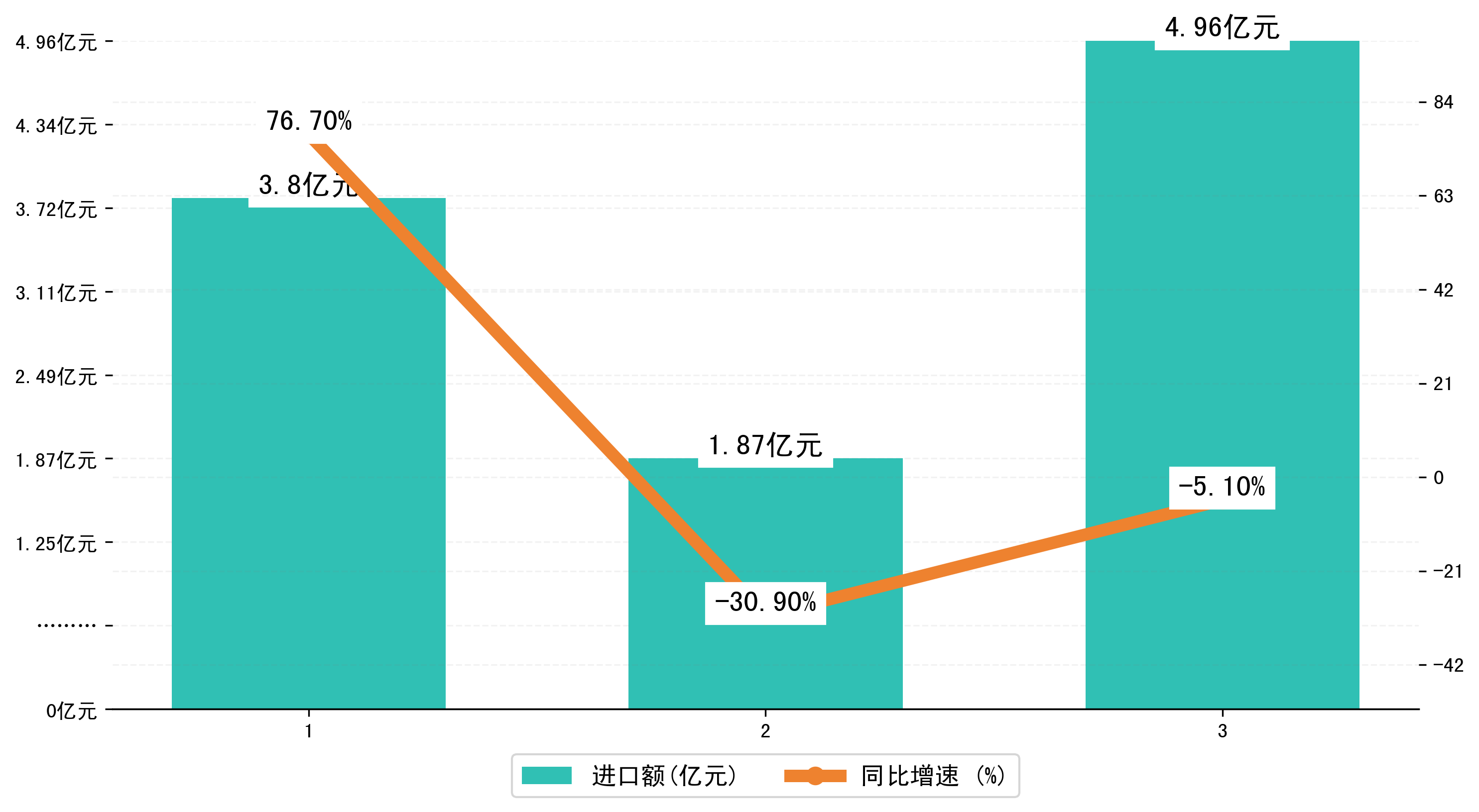 以人民币计,2024年1-3月洛阳市进口额为10,6266.7703万元,相比上年同期减少了5189.6213万元,同比减少了-5.10%。