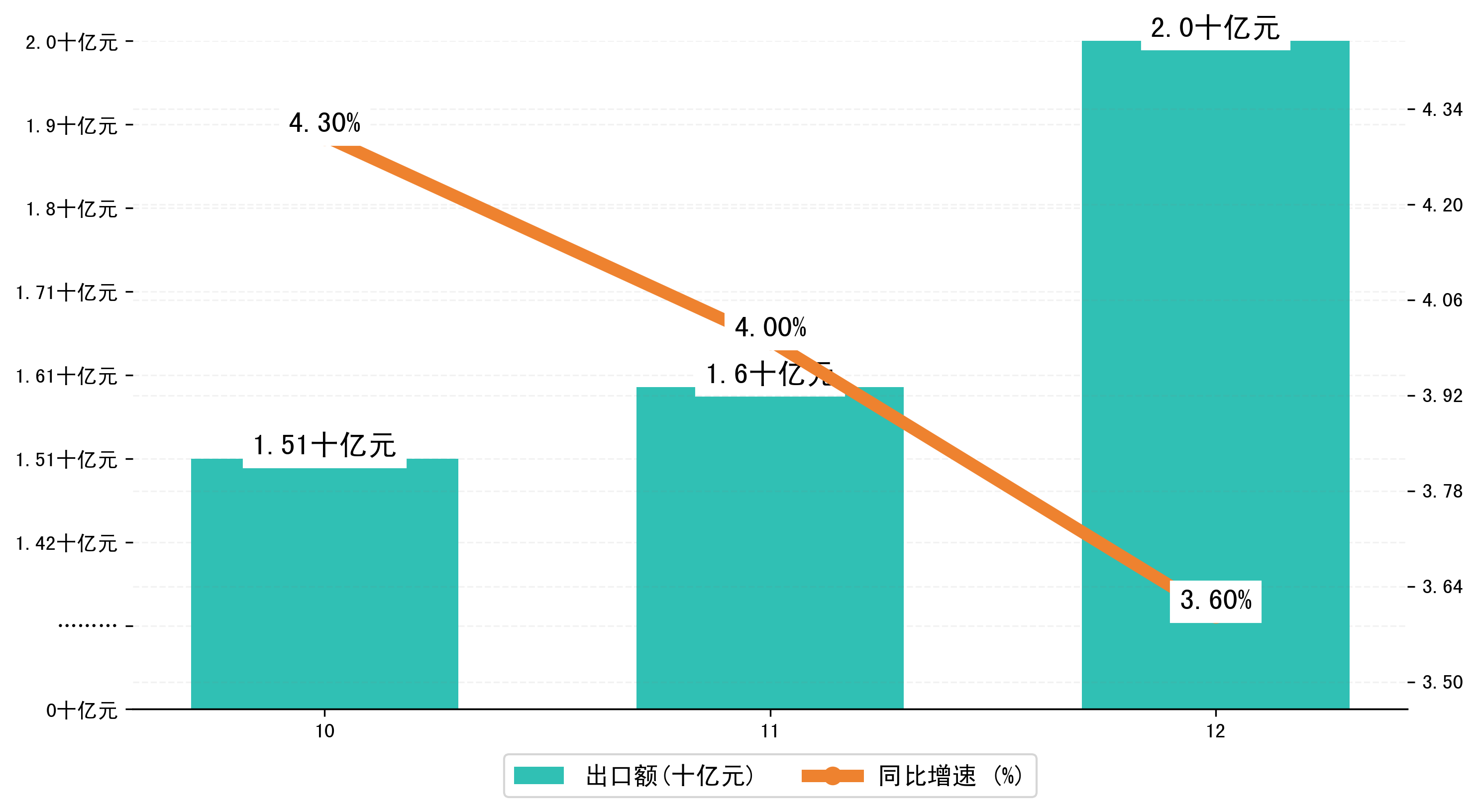 以人民币计,2024年12月洛阳市出口额为19,9732.6522万元,相比上月增加了4,0052.6769万元;相比上年同期增加了1804.8646万元,同比增加了3.60%。