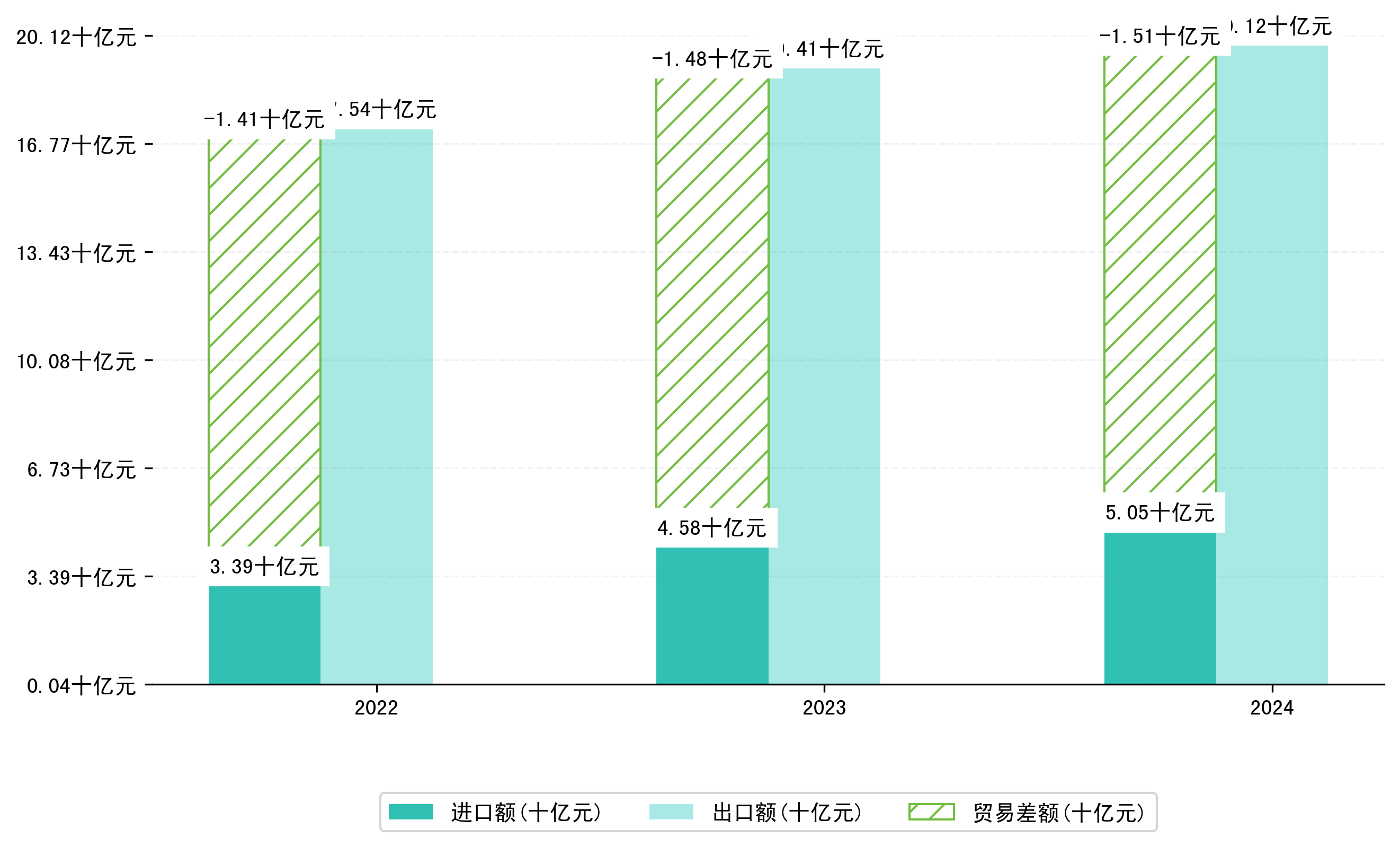 以人民币计,2024年1-12月洛阳市贸易差额为150,6939,3319万元(贸易顺差),相比上年同期增加了2,4060,3989万元,同比增加1.62%。