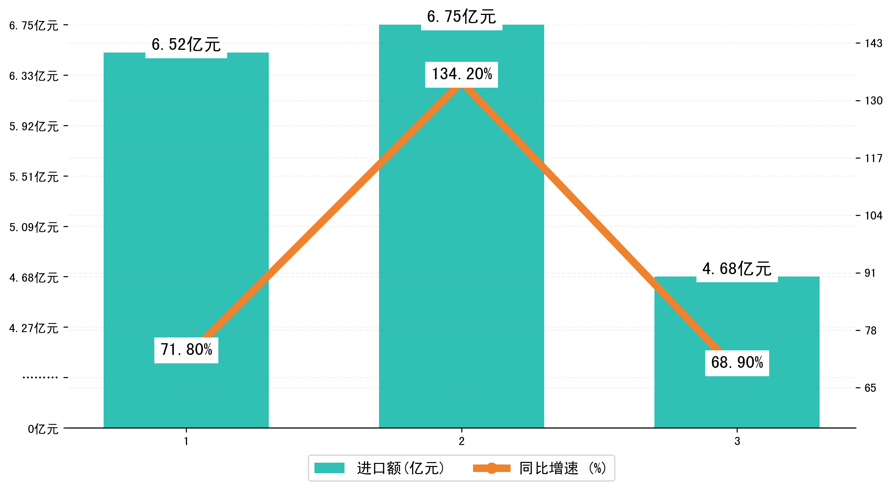 以美元计,2025年3月洛阳市进口额为6525.9392万美元,相比上月减少了2878.7518万美元;相比上年同期减少了459.5976万美元,同比增加67.00%。
