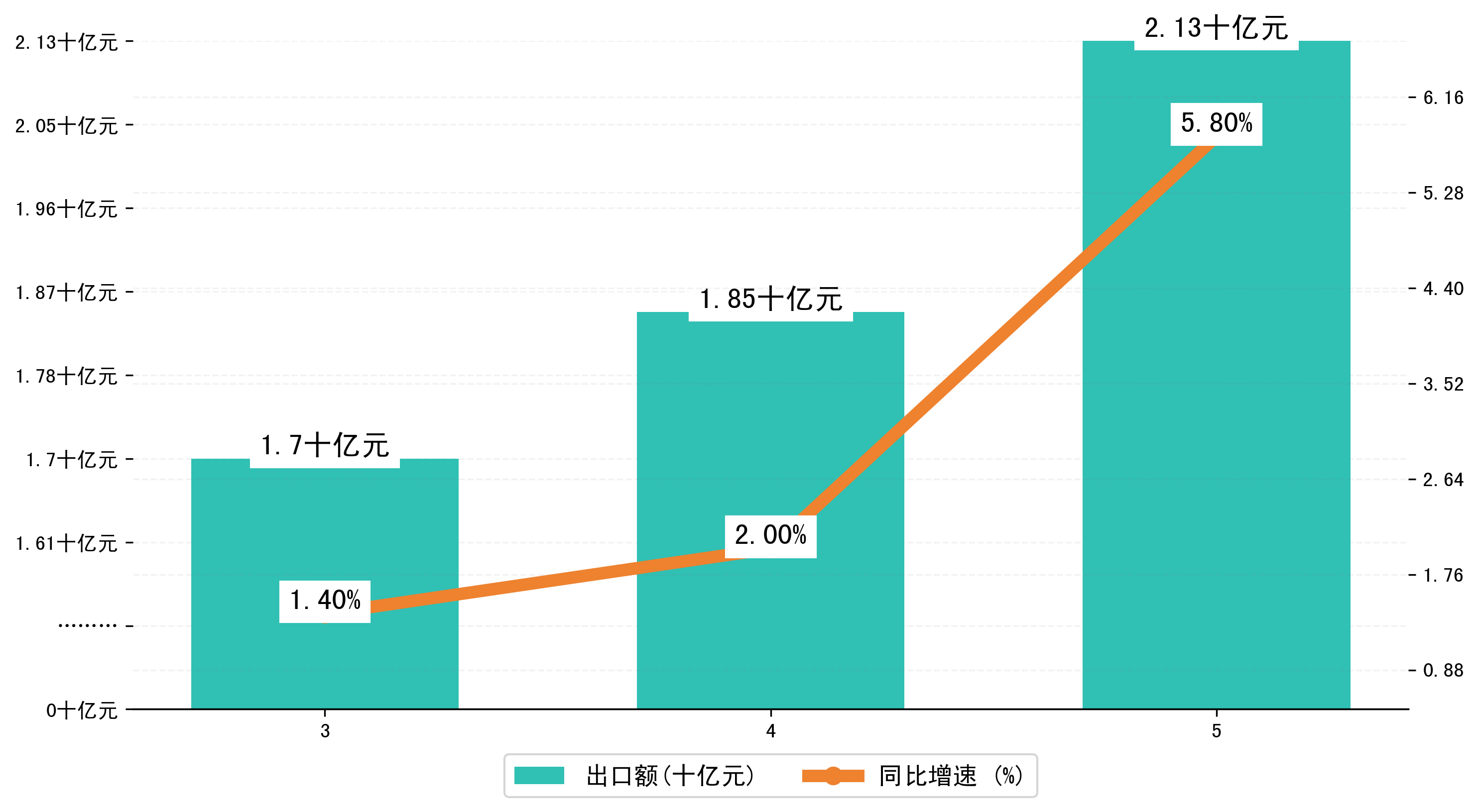 以人民币计,2025年1-5月洛阳市出口额为90,3742.923万元,相比上年同期增加了4,9294.9476万元,同比增加了5.80%。