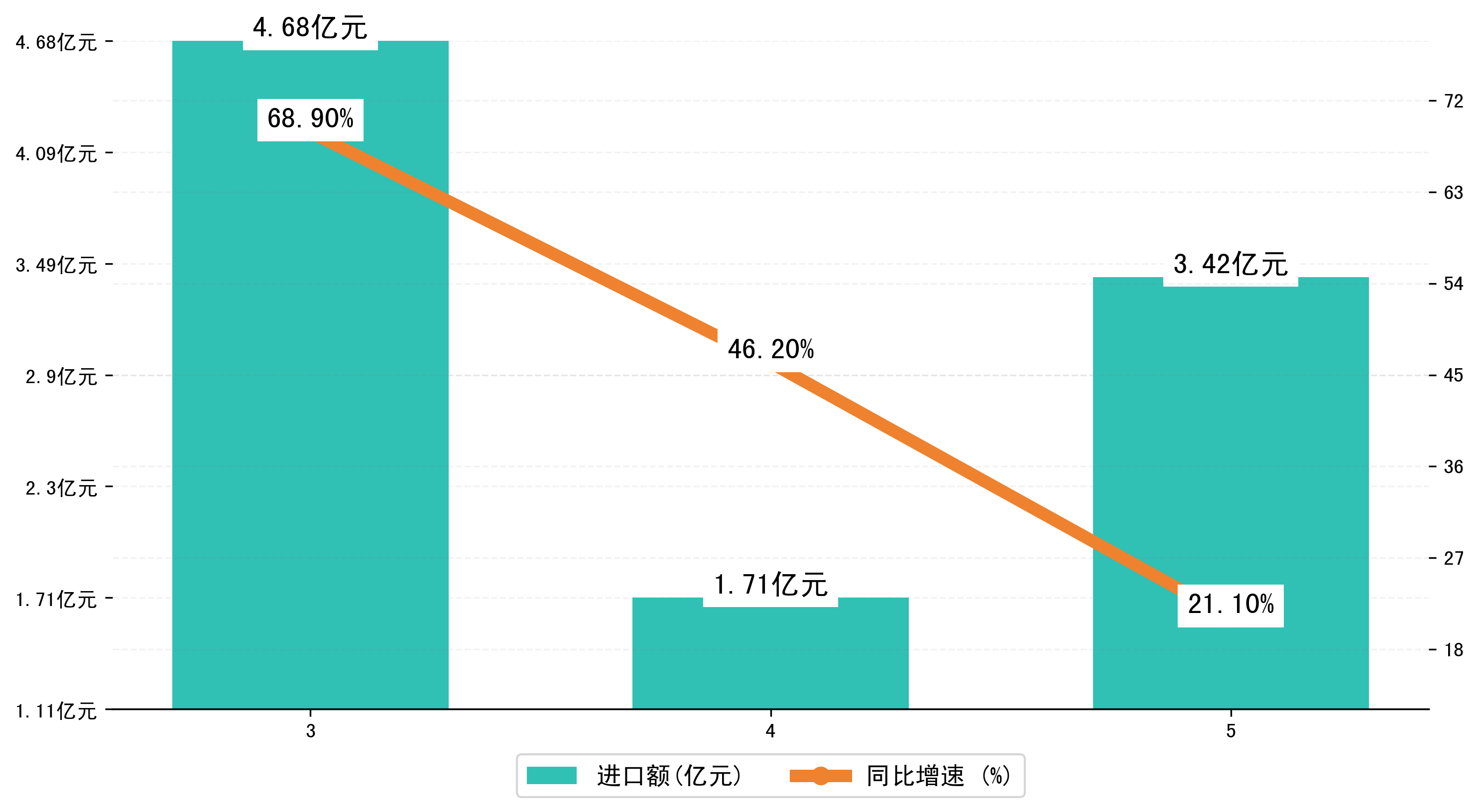以美元计,2025年1-5月洛阳市进口额为3,1736.0142万美元,相比上年同期增加了5225.5952万美元,同比增加19.70%。