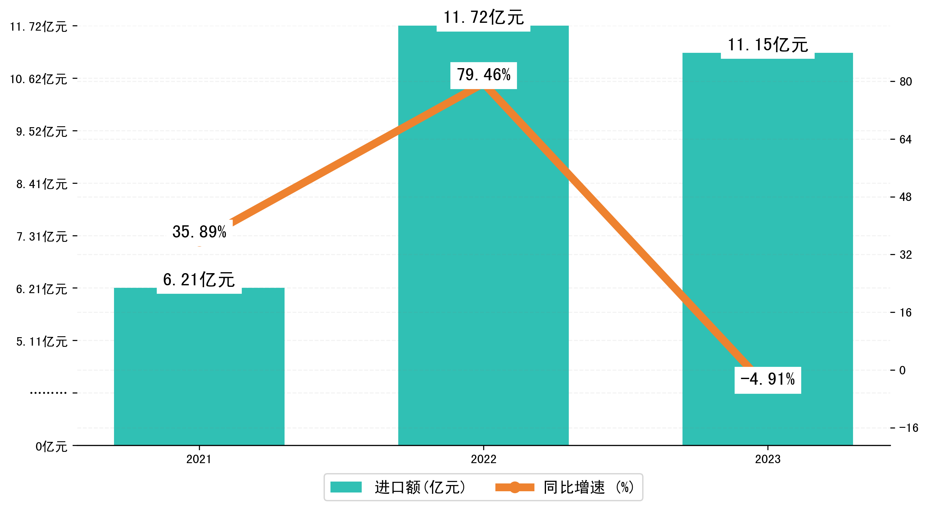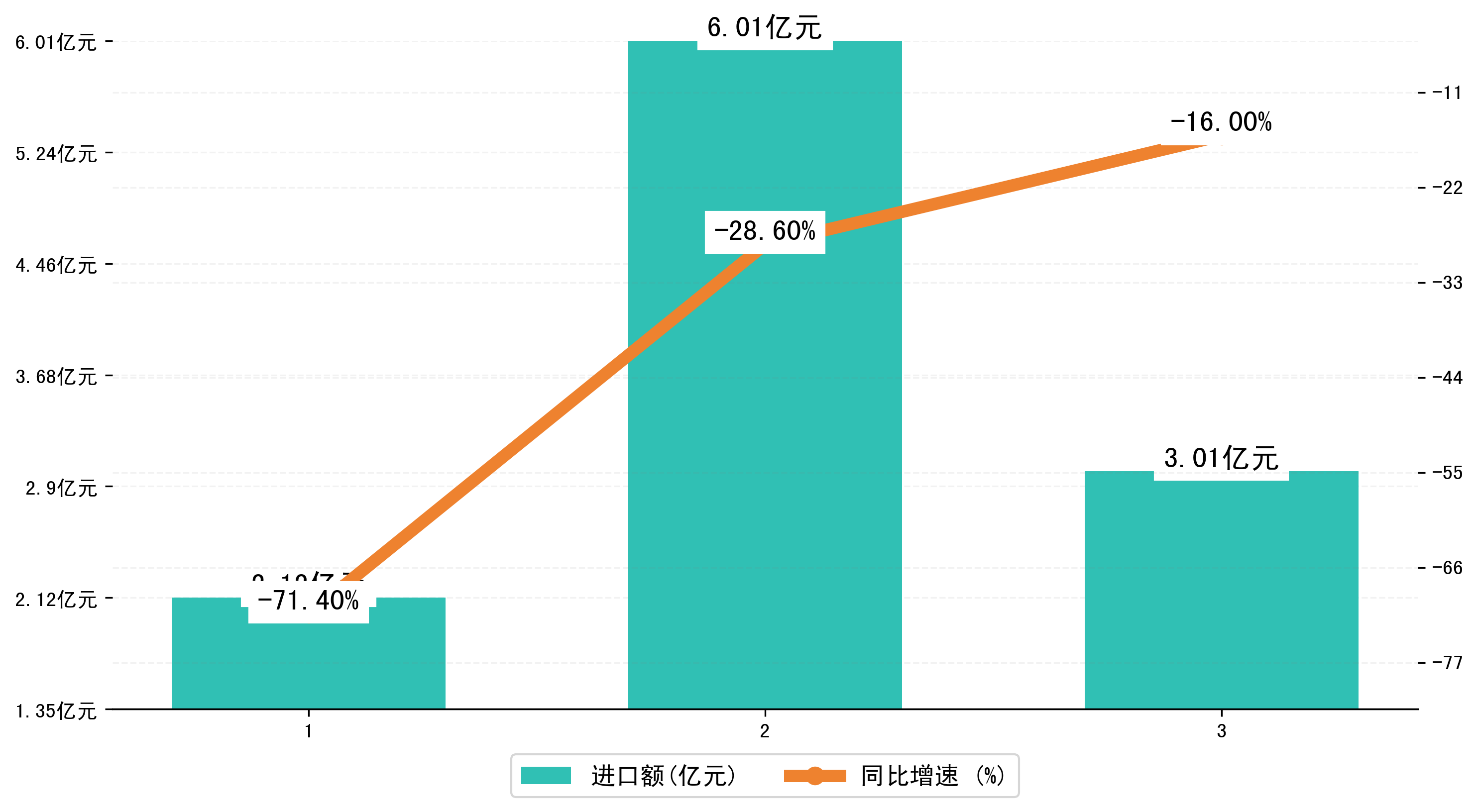 以美元计,2023年3月洛阳市进口额为4400.8352万美元,相比上月减少了4483.1696万美元;相比上年同期增加了38.1996万美元,同比减少-21.60%。