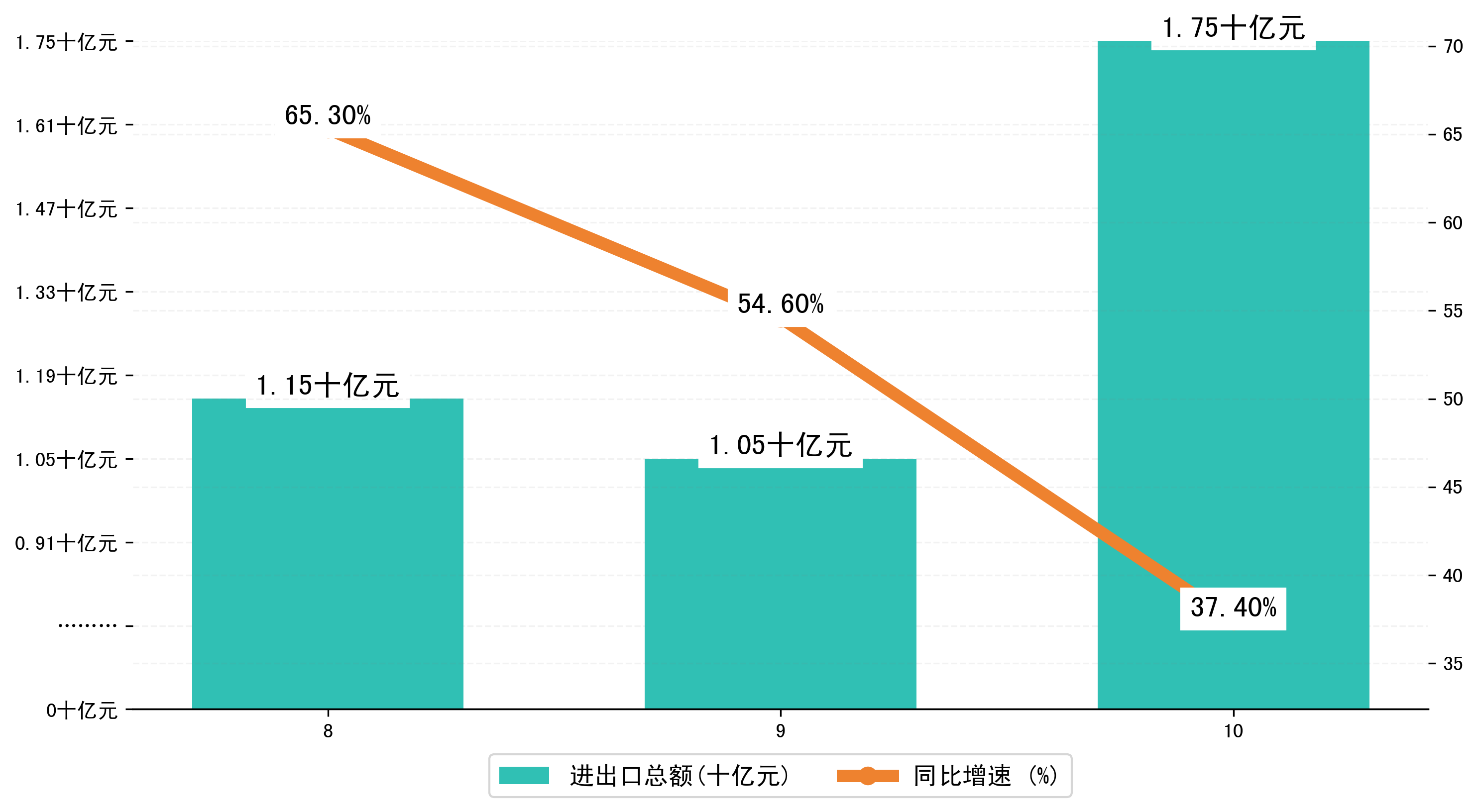 以人民币计,2024年10月泸州市进出口总额为17,4525.4457万元,相比上月增加了6,9651.2655万元;相比上年同期减少了7,0588.5332万元,同比增加了37.40%。