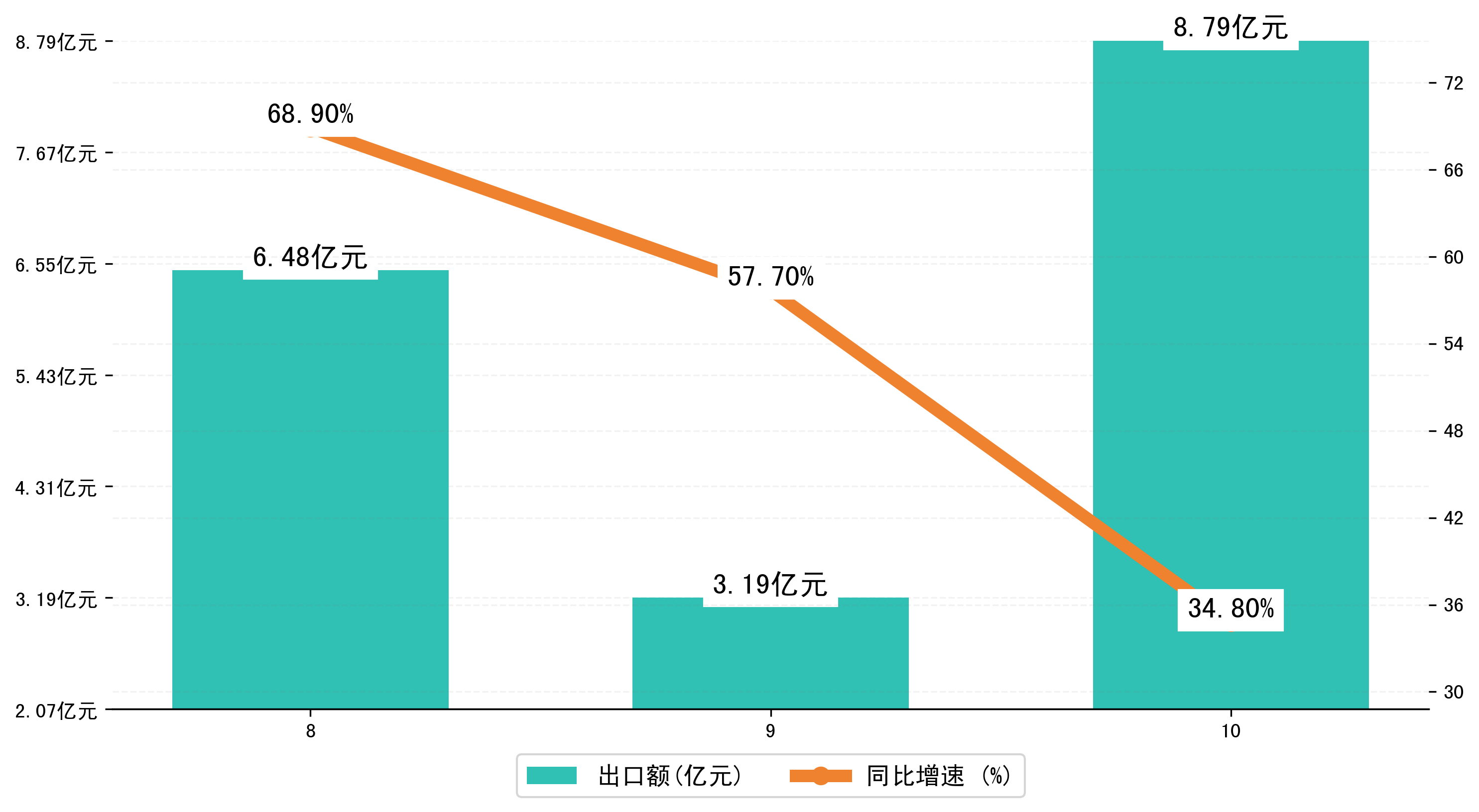 以人民币计,2024年10月泸州市出口额为8,7891.1174万元,相比上月增加了5,6033.1968万元;相比上年同期减少了8,0140.0199万元,同比增加了34.80%。
