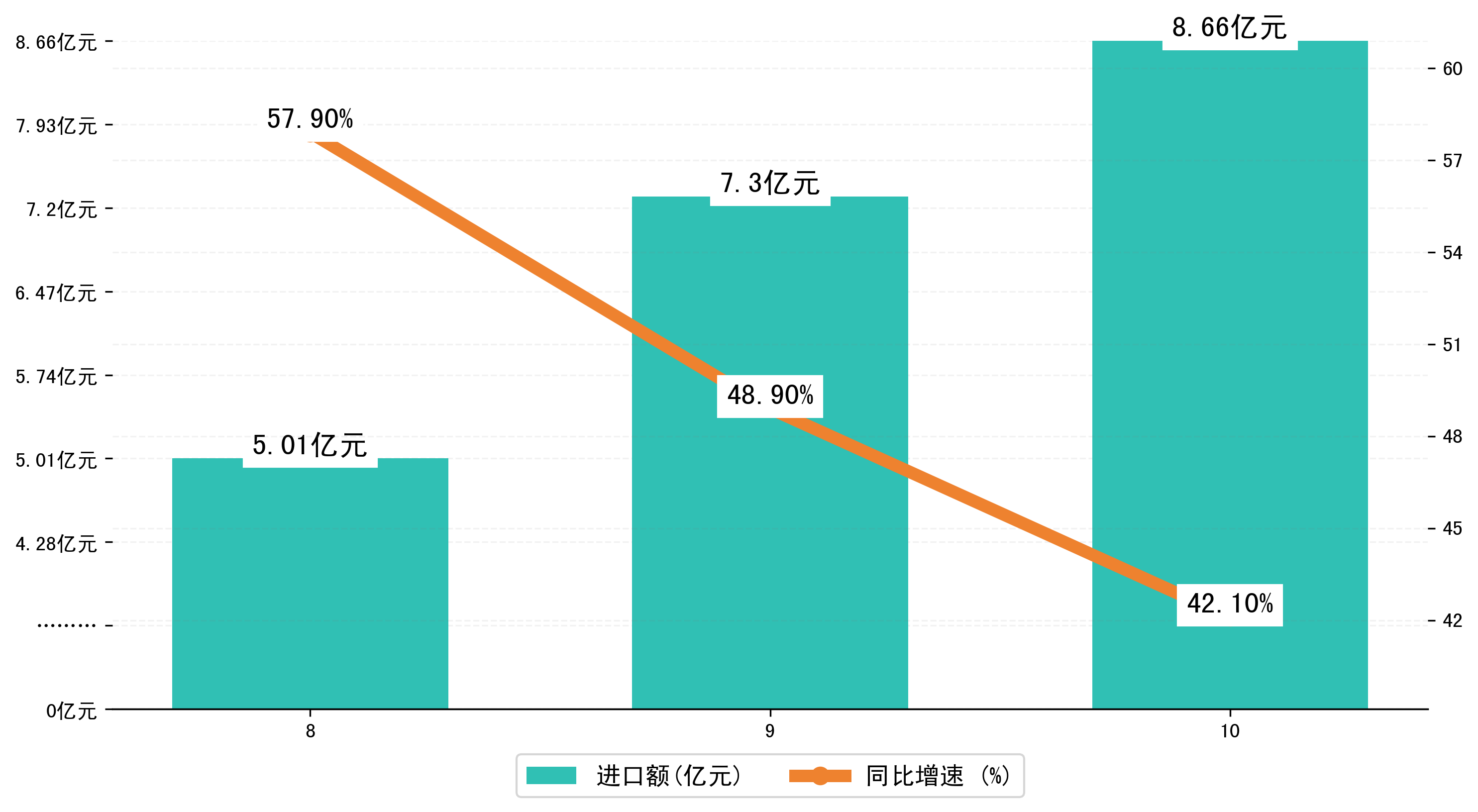 以人民币计,2024年10月泸州市进口额为8,6634.3282万元,相比上月增加了1,3618.0686万元;相比上年同期增加了9551.4866万元,同比增加了42.10%。