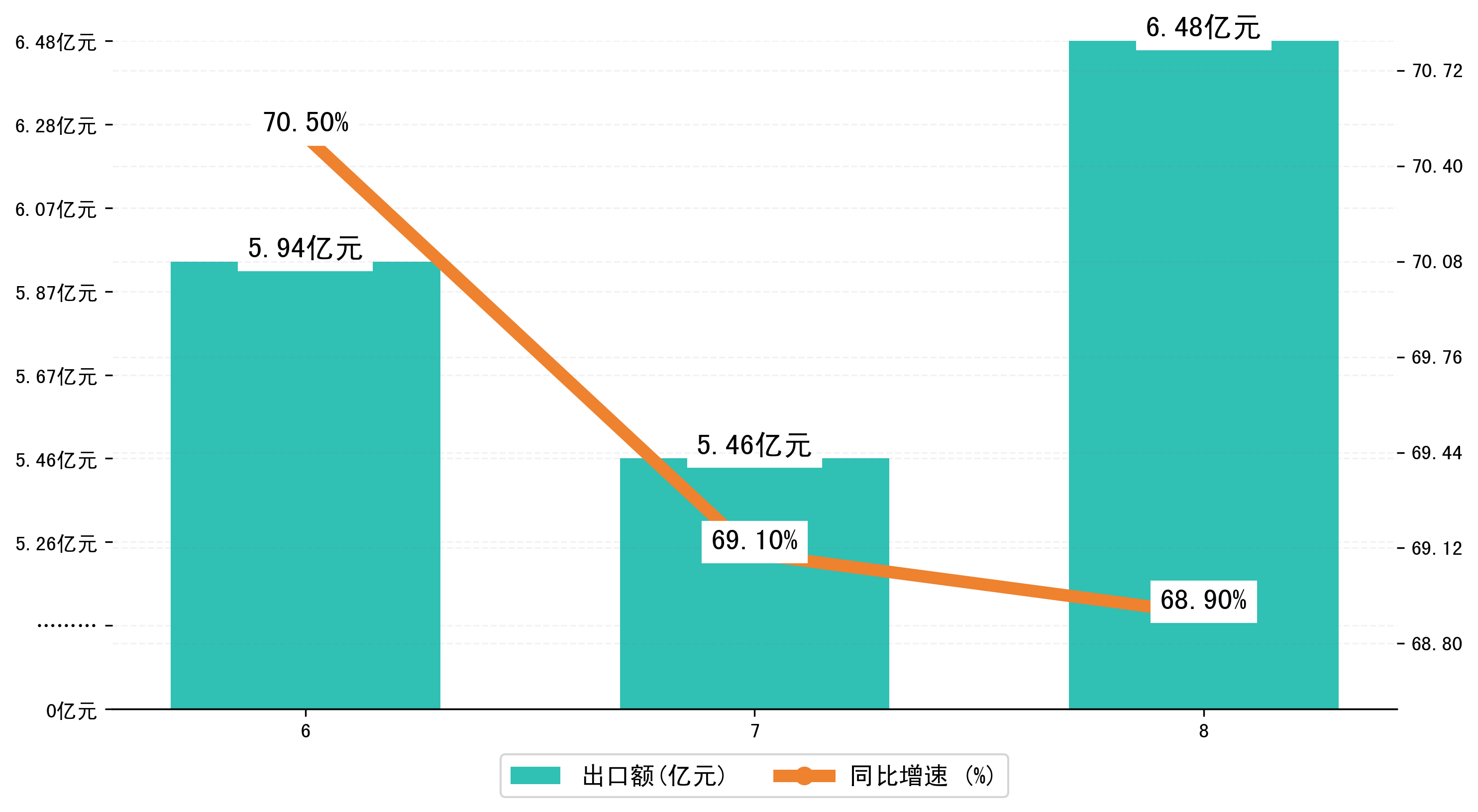 以人民币计,2024年1-8月泸州市出口额为97,2897.8224万元,相比上年同期增加了32,9508.6476万元,同比增加了68.90%。