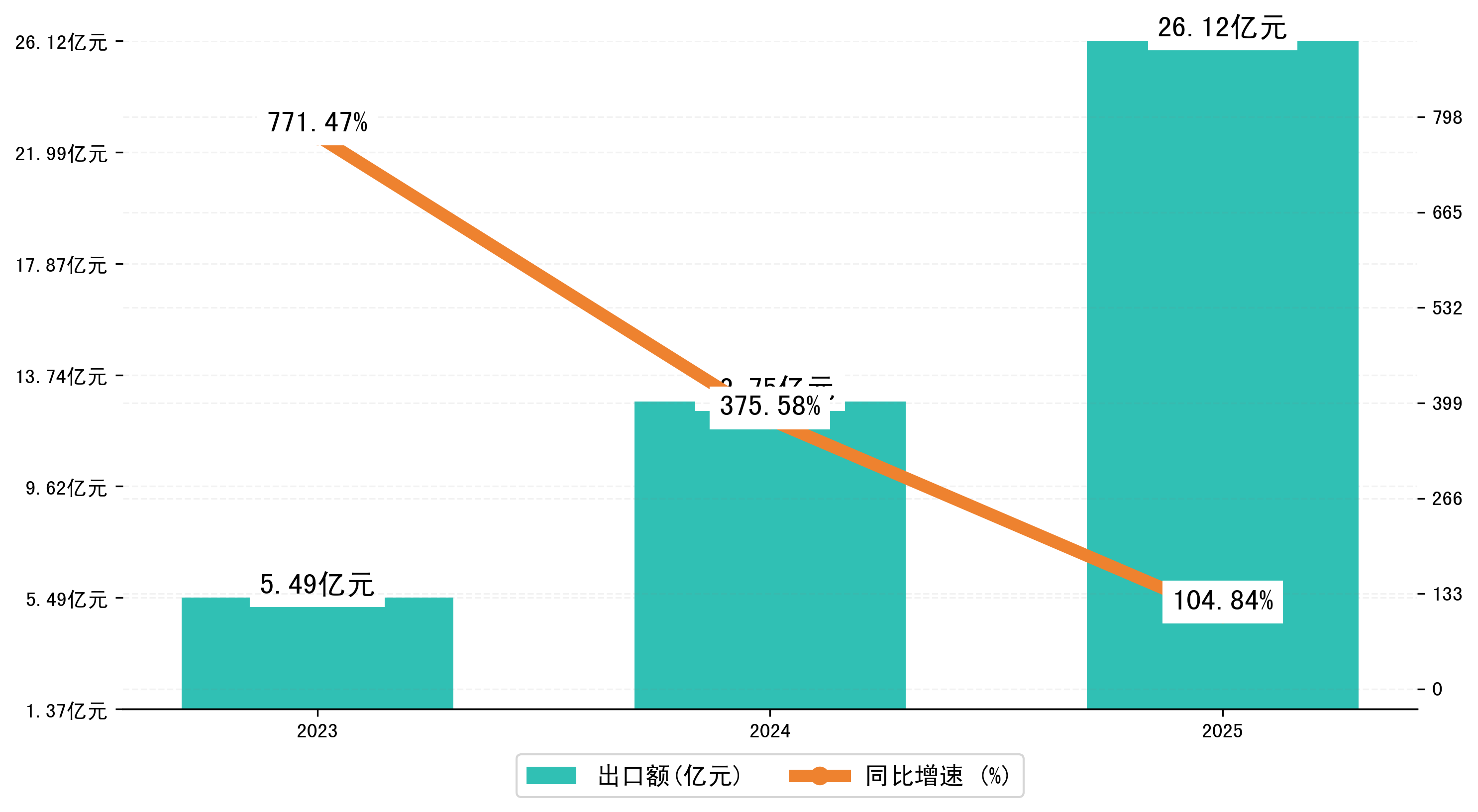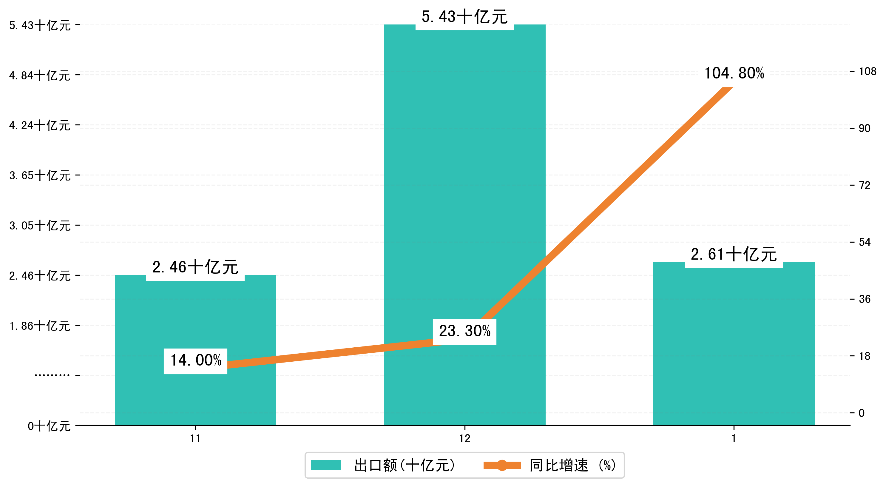 以人民币计,2025年1-1月泸州市出口额为26,1196.9498万元,相比上年同期增加了13,3682.1384万元,同比增加了104.80%。
