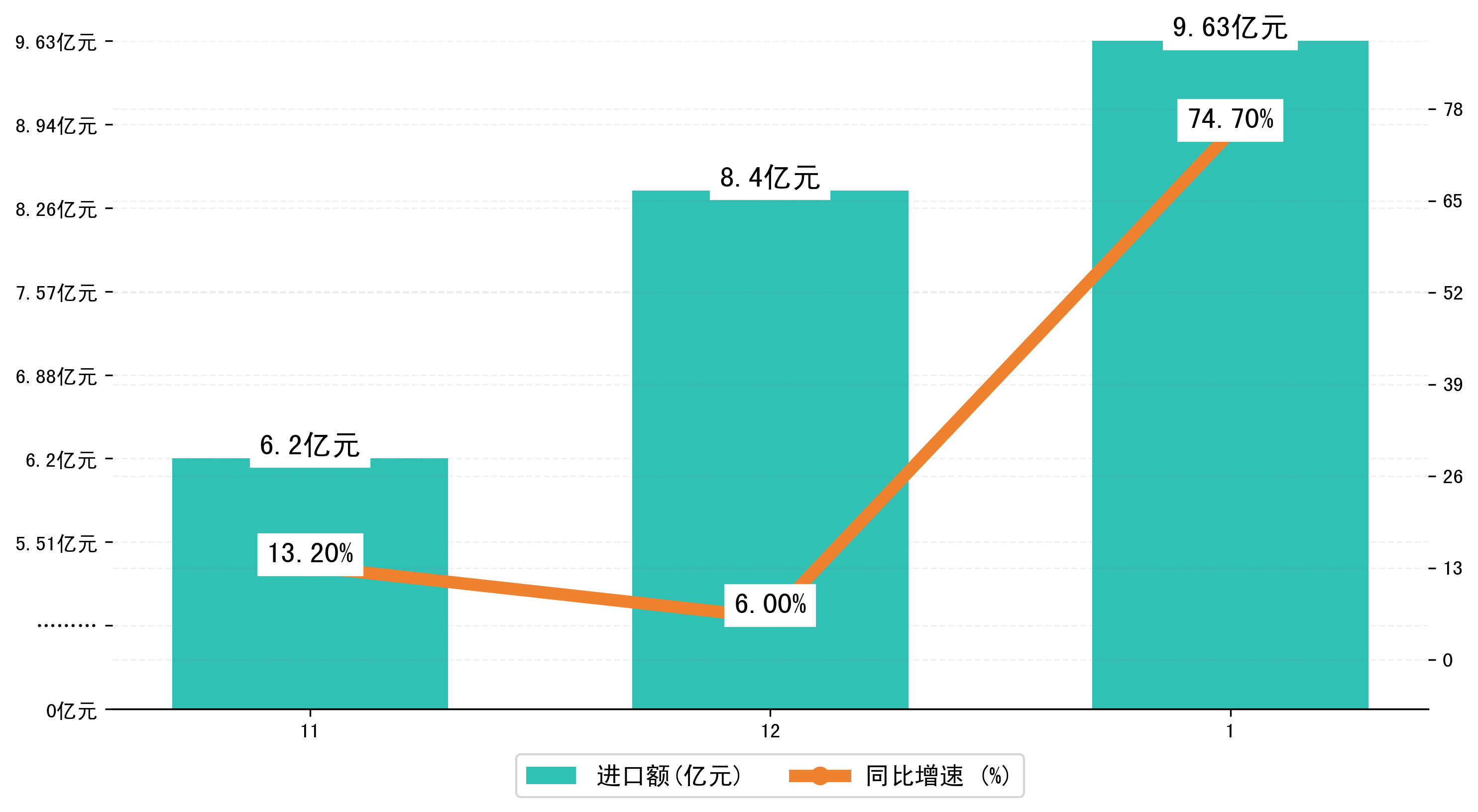 以美元计,2025年1月泸州市进口额为1,3381.0872万美元,相比上月增加了1682.7986万美元;相比上年同期增加了5600.0492万美元,同比增加72.10%。