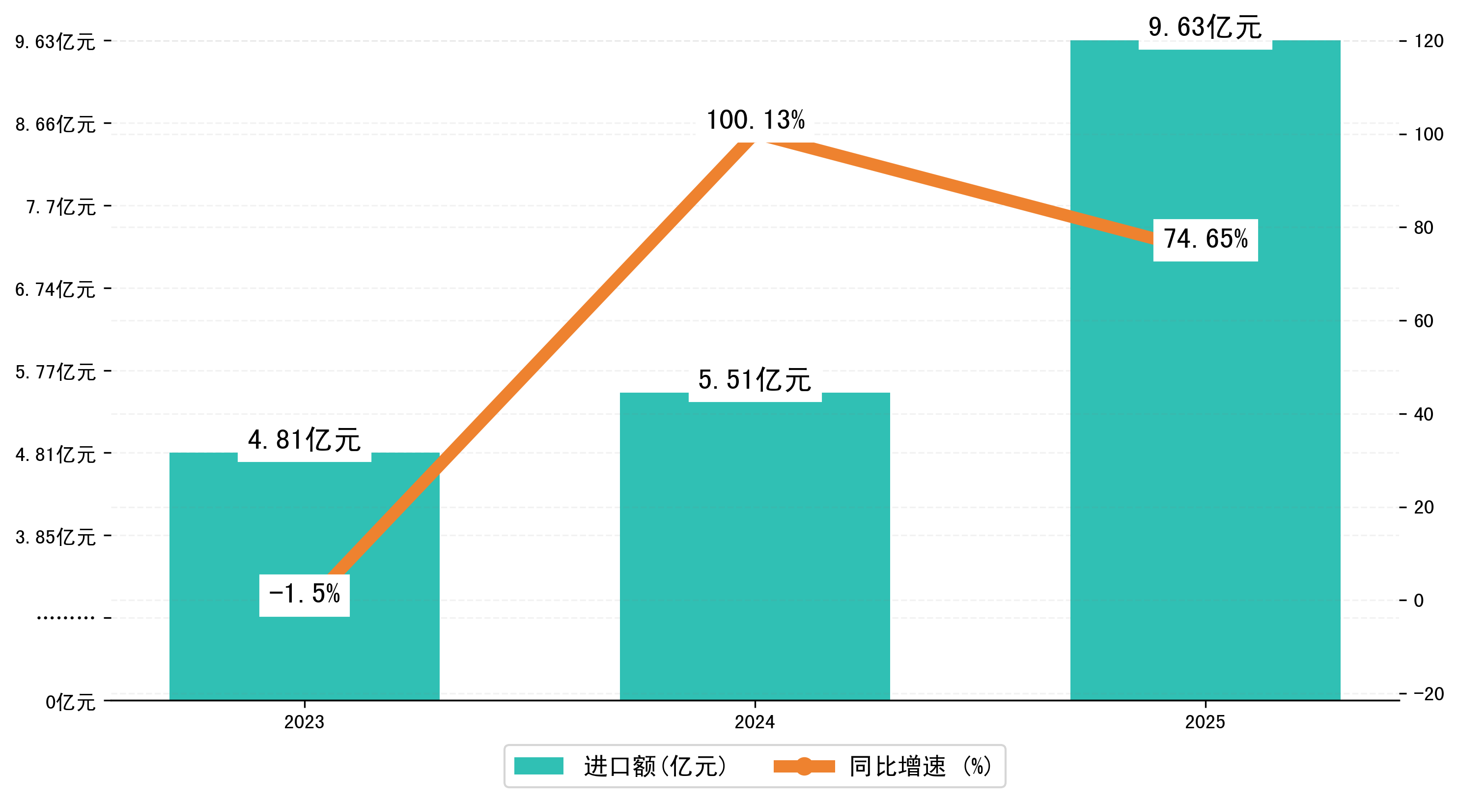 以人民币计,2025年1月泸州市进口额为9,6265.837万元,相比上月增加了1,2314.5736万元;相比上年同期增加了4,1148.0795万元,同比增加了74.70%。