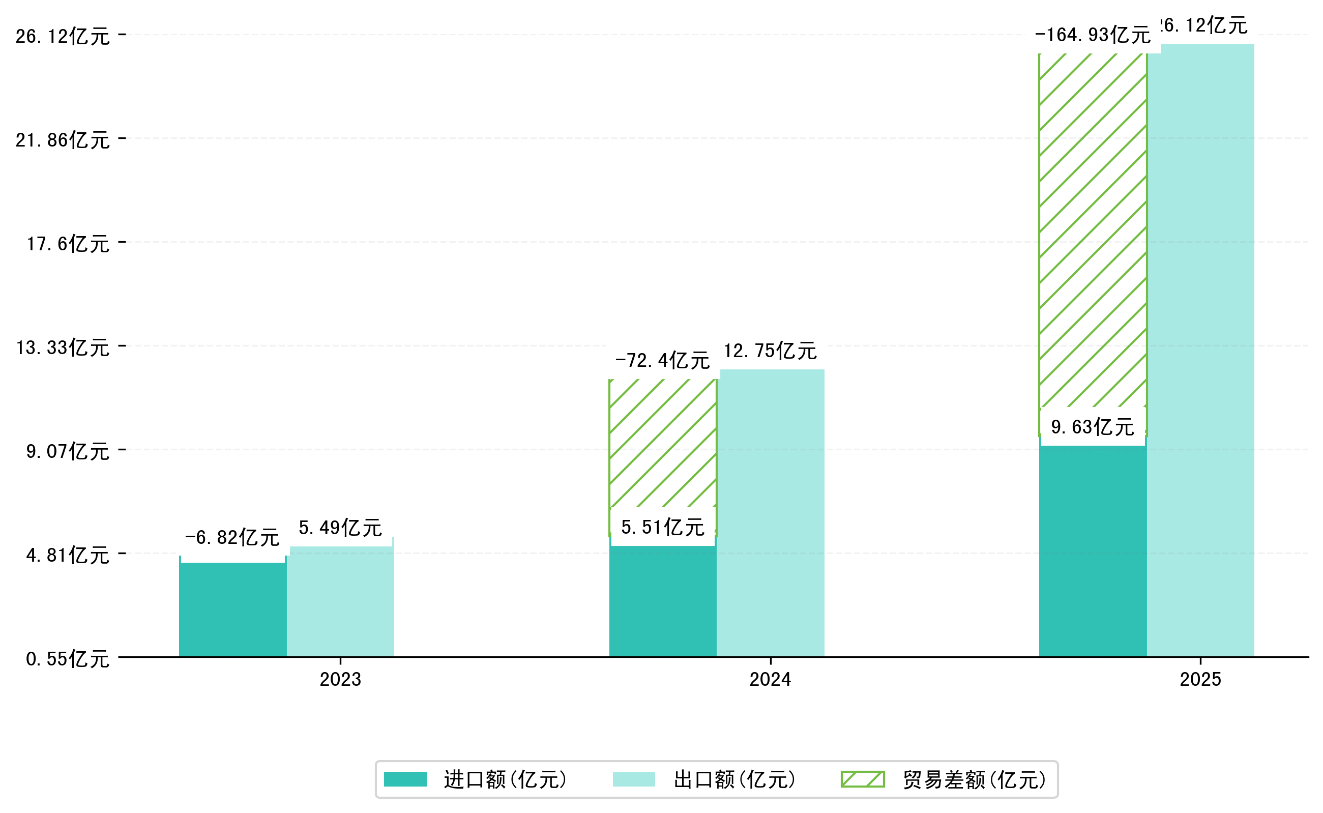 以人民币计,2025年1-1月泸州市贸易差额为16,4931,1128万元(贸易顺差),相比上年同期增加了9,2534,0589万元,同比增加127.81%。