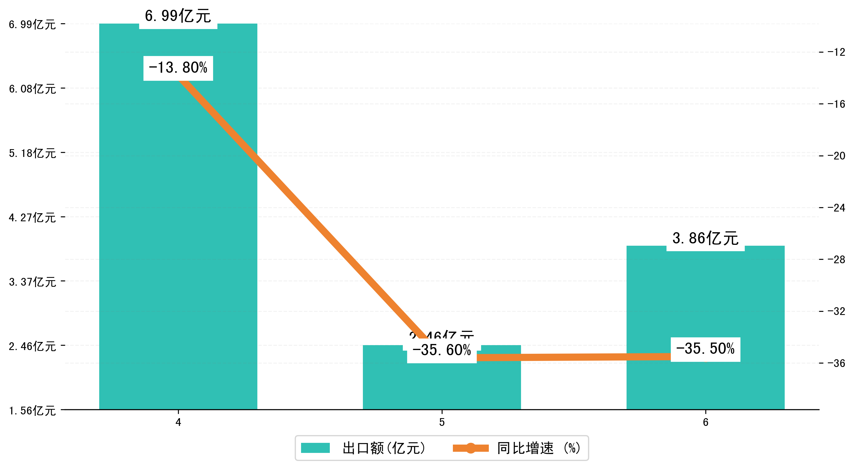 以美元计,2025年1-6月泸州市出口额为7,6628.2796万美元,相比上年同期减少了4,3574.1779万美元,同比减少-36.20%。