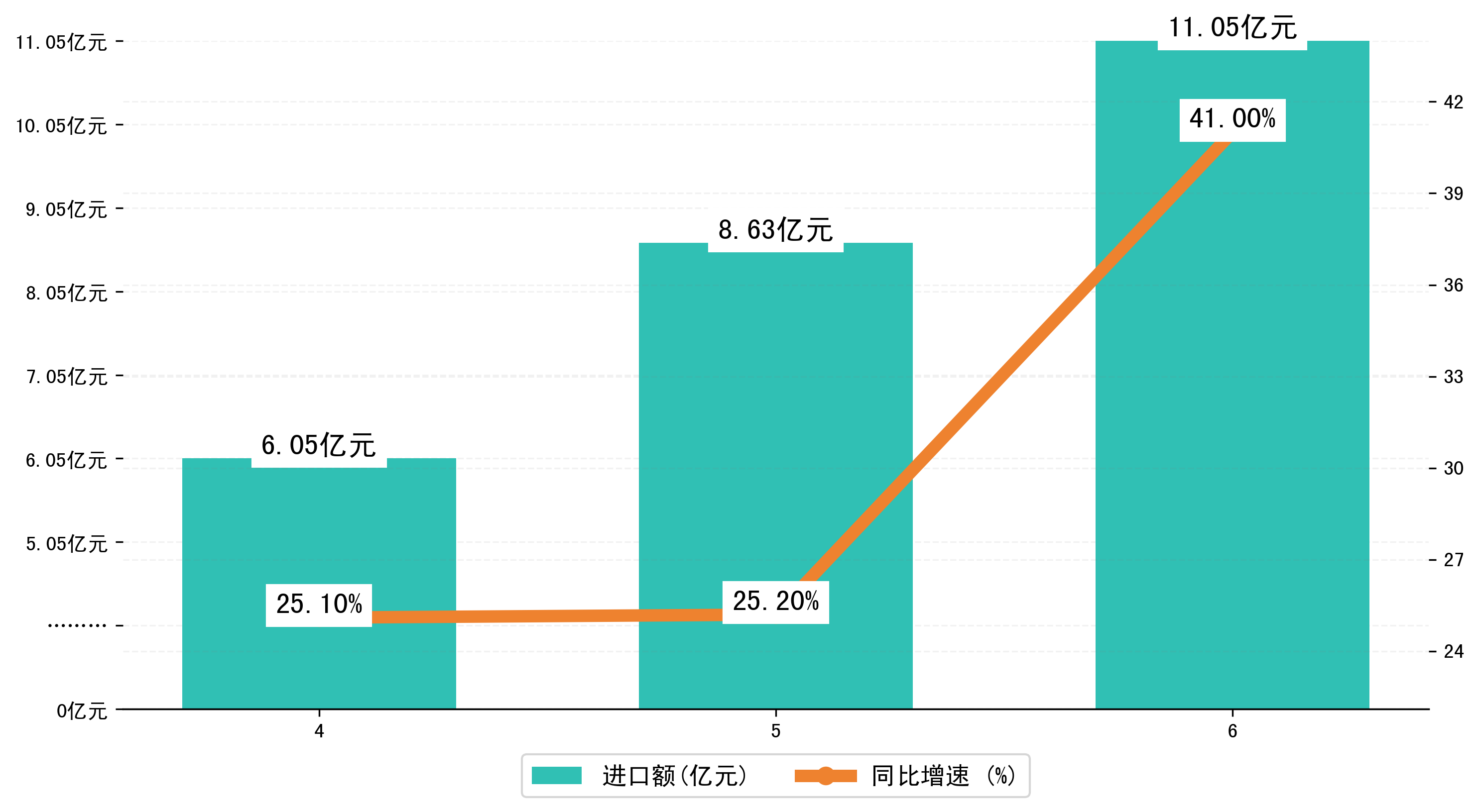以美元计,2025年6月泸州市进口额为1,5367.3994万美元,相比上月增加了3392.3708万美元;相比上年同期增加了8799.451万美元,同比增加39.30%。