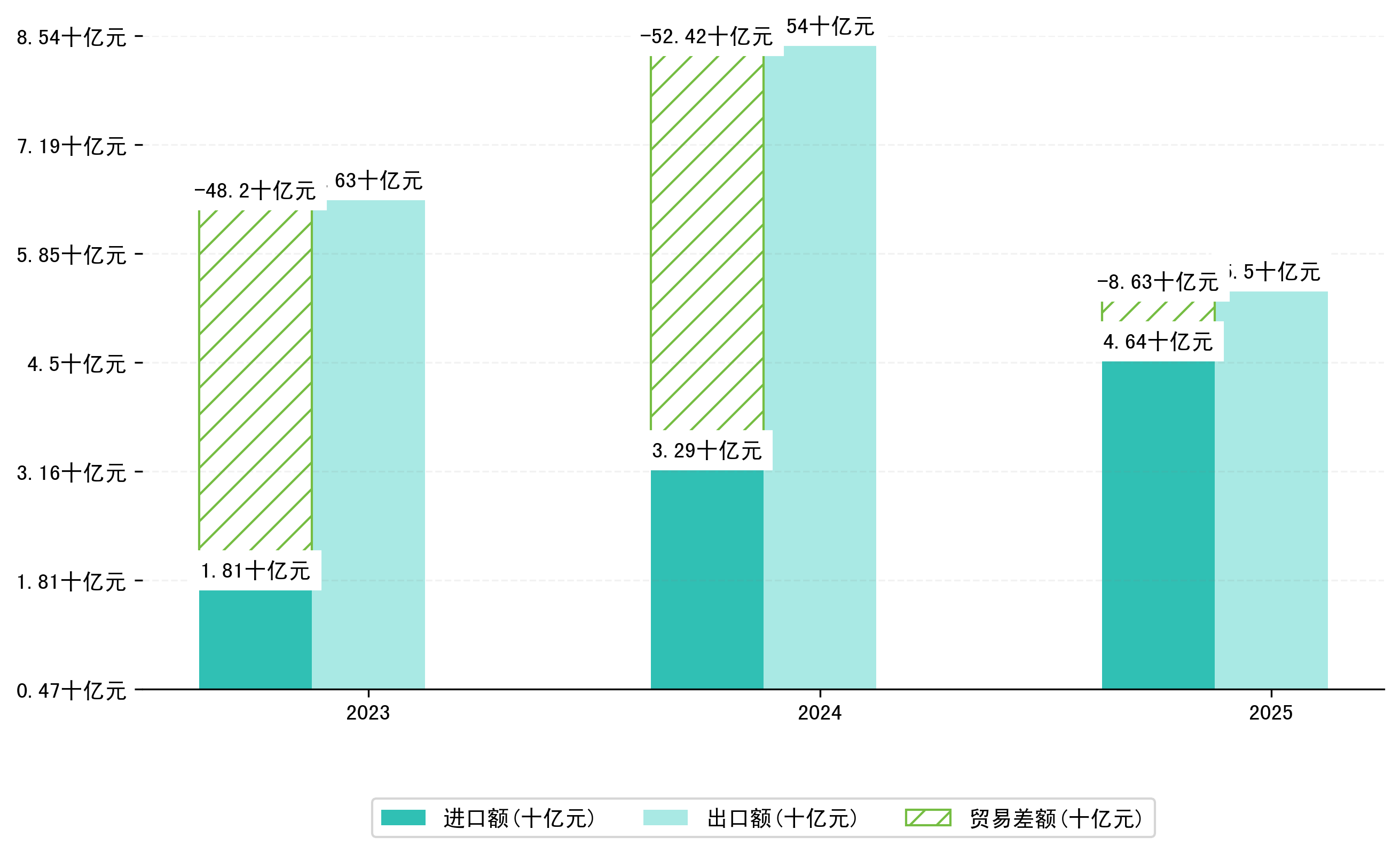 以人民币计,2025年1-6月泸州市贸易差额为8,6339,4411万元(贸易顺差),相比上年同期减少了43,7853,1904万元,同比减少-83.53%。