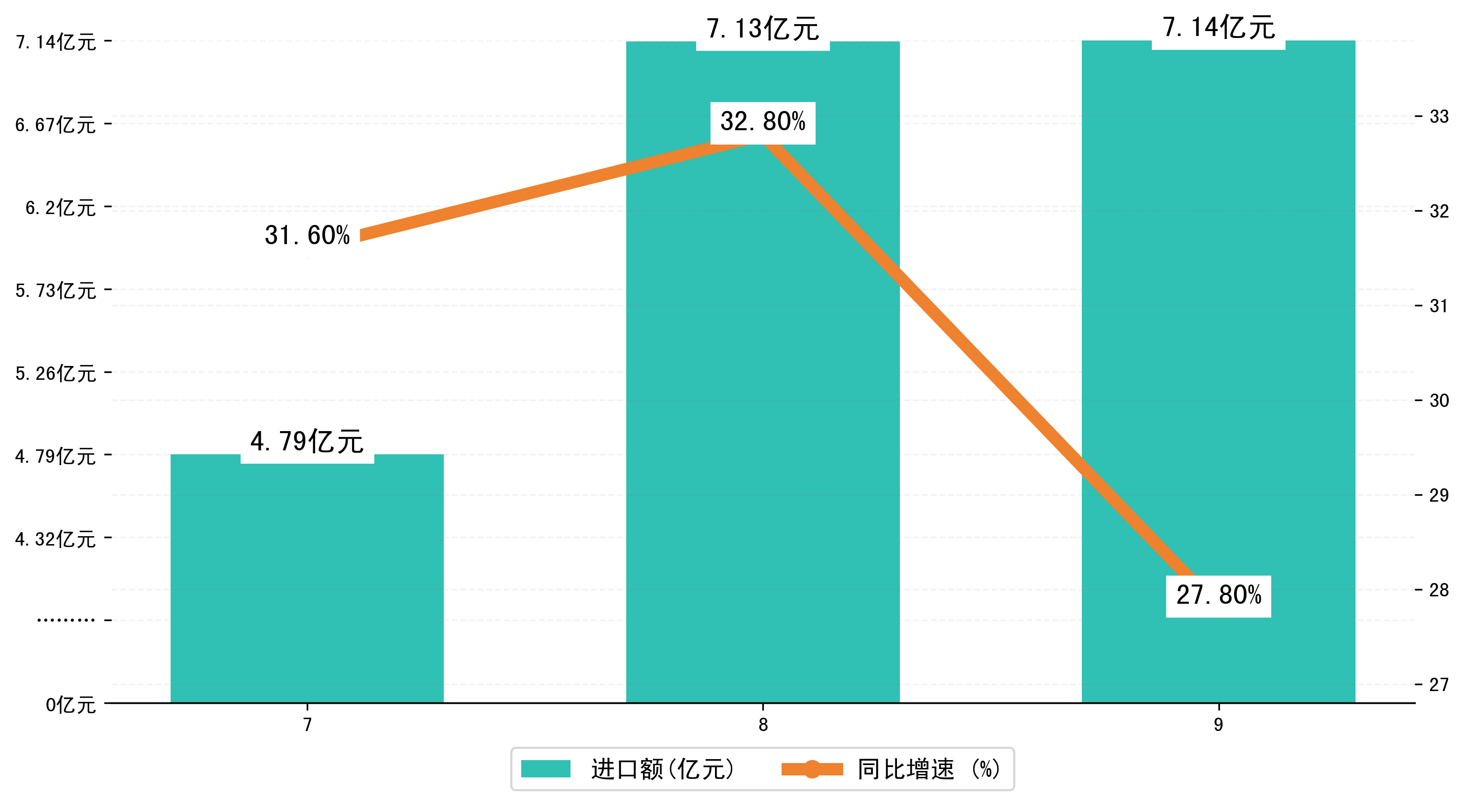以人民币计,2025年1-9月泸州市进口额为65,4502.8939万元,相比上年同期增加了13,6354.0907万元,同比增加了27.80%。
