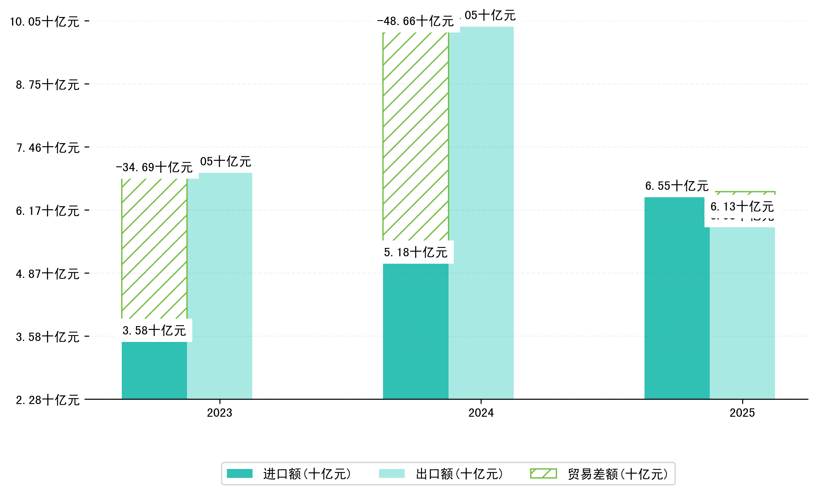 以人民币计,2025年1-9月泸州市贸易差额为6,1259,4753万元(贸易逆差),相比上年同期减少了54,7866,4151万元,同比减少-112.59%。
