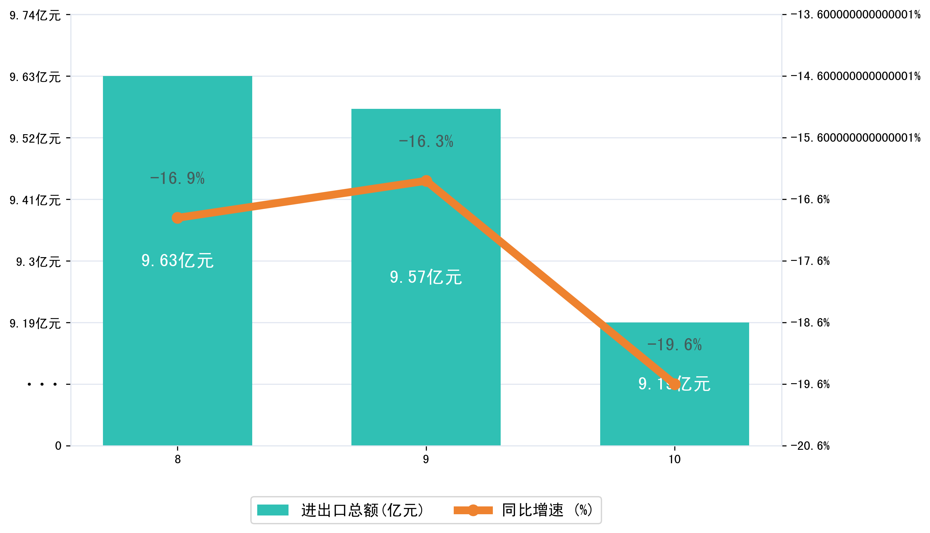 以人民币计,2025年10月泸州市进出口总额为9,1935.3013万元,相比上月减少了3790.2469万元;相比上年同期减少了8,2590.1444万元,同比减少了-19.60%。