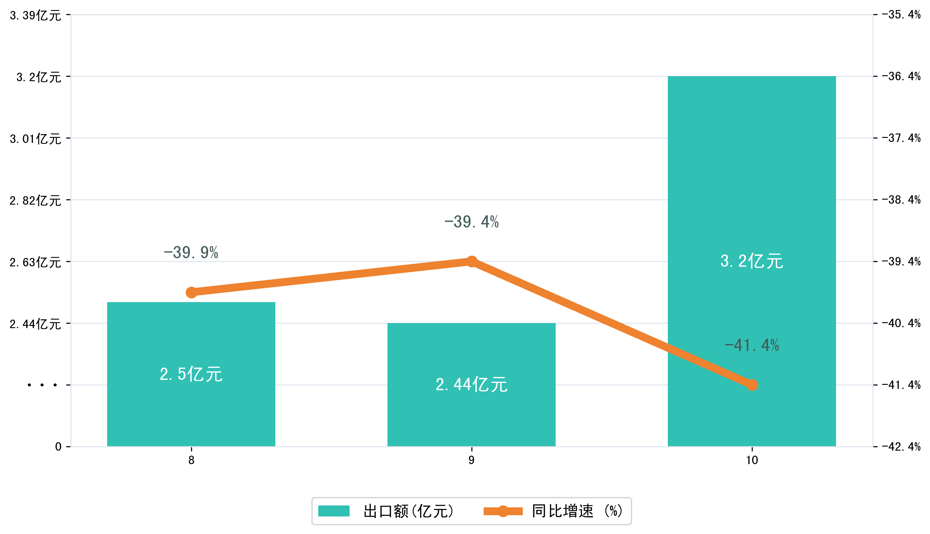 以人民币计,2025年10月泸州市出口额为3,2013.5101万元,相比上月增加了7638.367万元;相比上年同期减少了5,5877.6073万元,同比减少了-41.40%。