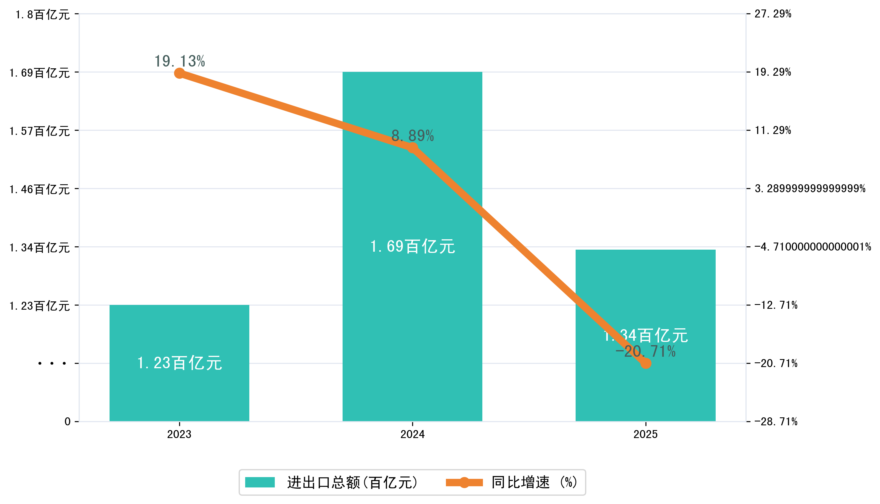 以人民币计,2025年1-10月泸州市进出口总额为133,9456.1954万元,相比上年同期减少了34,9933.9467万元,同比减少了-19.60%。