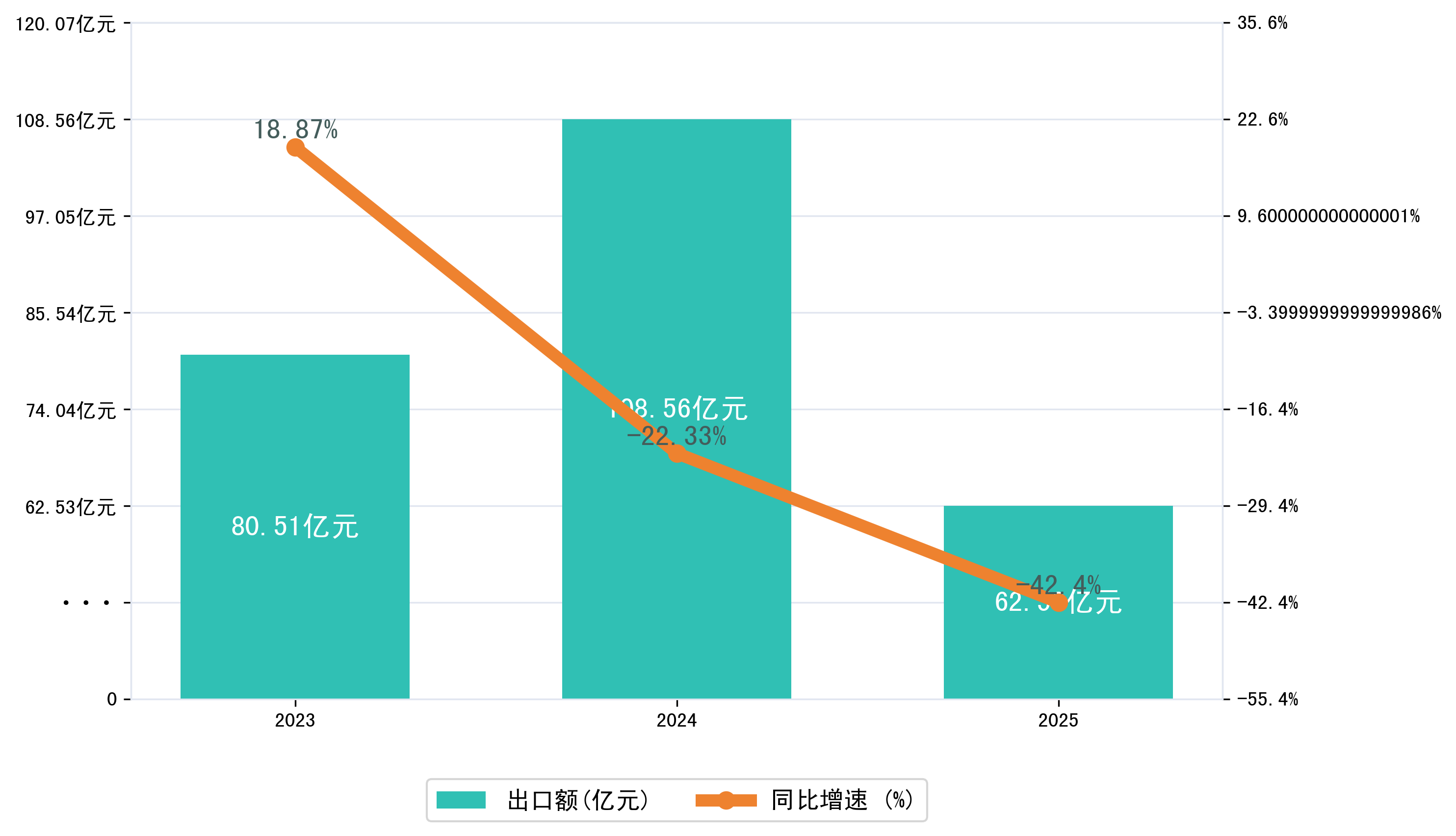 以美元计,2025年1-10月泸州市出口额为8,7125.8196万美元,相比上年同期减少了6,5724.6444万美元,同比减少-42.00%。