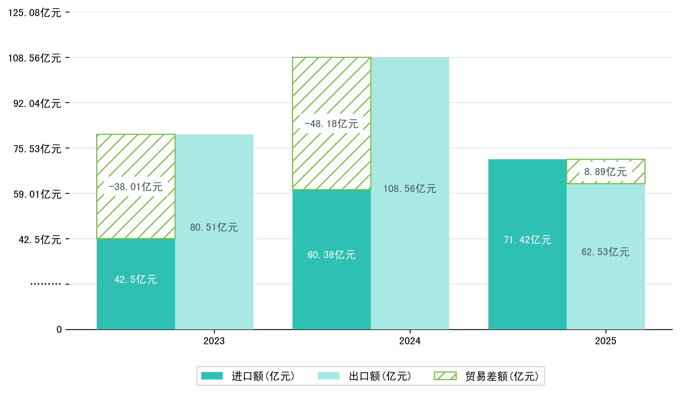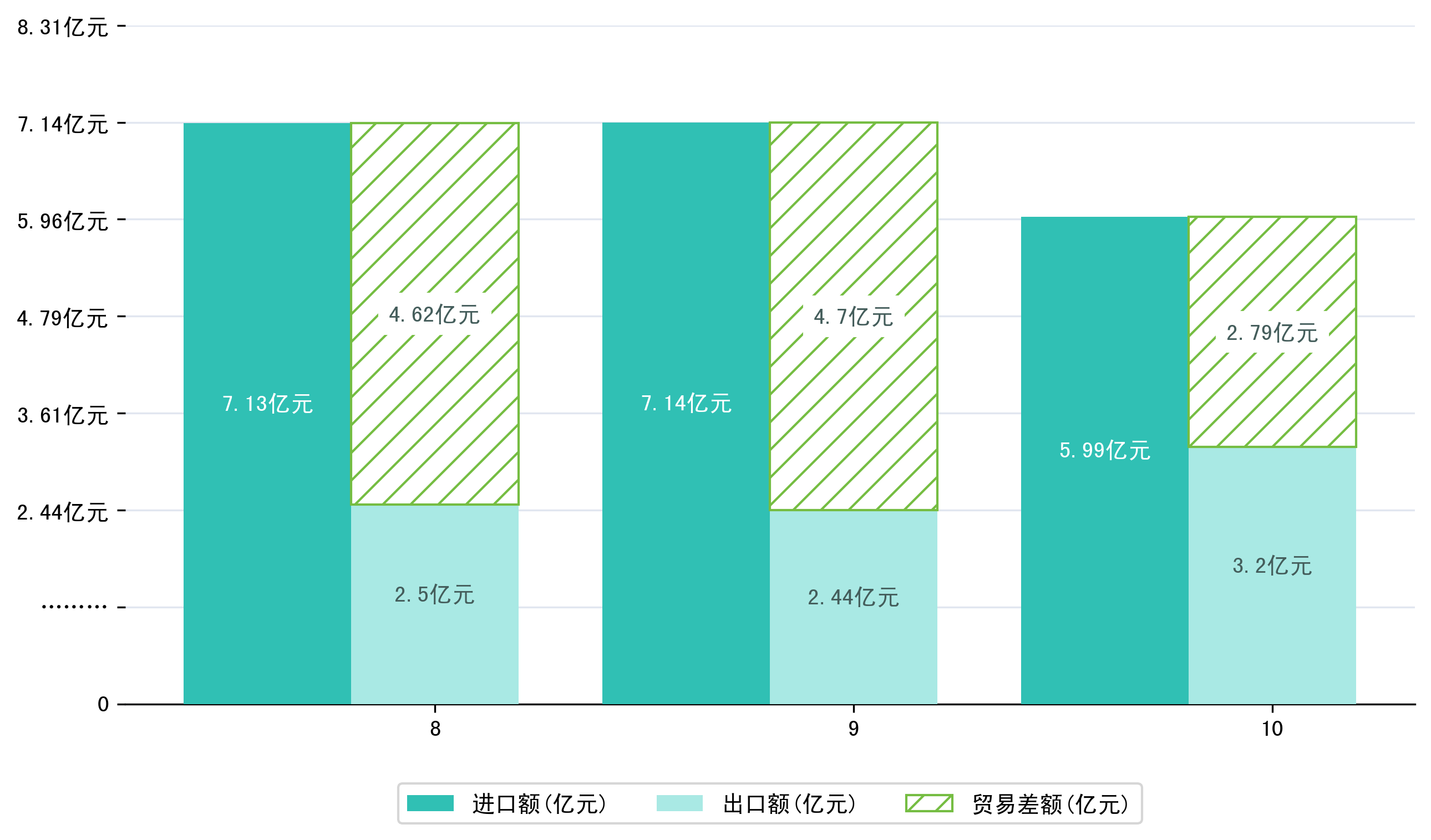 以美元计,2025年1-10月泸州市贸易差额为1,2475,4553万美元(贸易逆差),相比上年同期减少了8,0299,7881万美元,同比减少-118.39%。