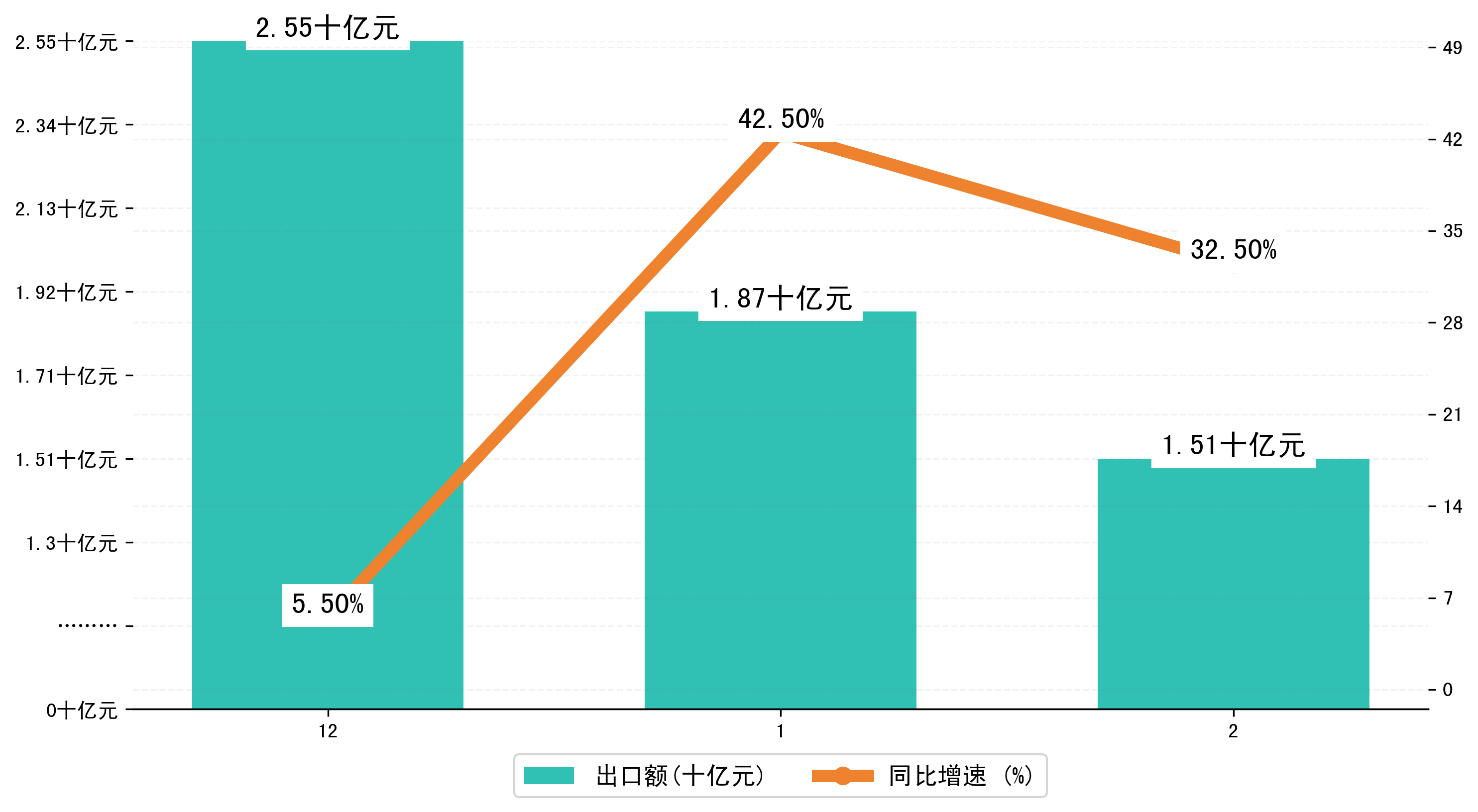 以人民币计,2023年1-2月马鞍山市出口额为33,7810.1991万元,相比上年同期增加了8,2737.4404万元,同比增加了32.50%。